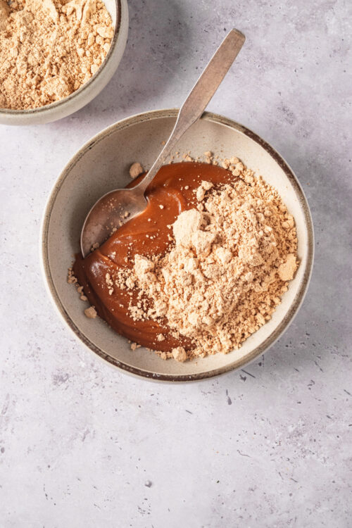 - Add the peanut flour and stir until a stiff dough forms. If the dough feels too sticky, add a little more peanut flour.
