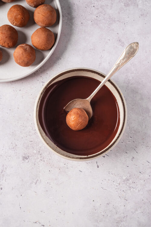 - Dip each frozen ball into the melted chocolate, allowing the excess to drip off before placing it back on the sheet. Allow the chocolate to set completely before serving.