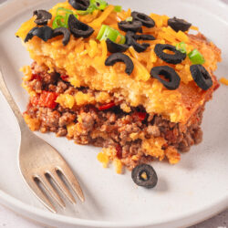 And now wait until you see how the ingredients from some of our favorite Mexican dishes, like ground beef cooked in taco seasoning, onions and bell peppers, corn, cheddar cheese, and a cornbread-like topping, take to the layering and baking process of a traditional shepherd’s pie. It’s still a comfort food, to be sure, but one bursting with a combination of delicious flavors and wonderful textures that is simple to make and guaranteed to please kids and grown-ups alike!