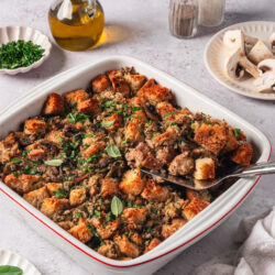 Obviously, mushroom stuffing and turkey are a match made in Thanksgiving heaven. However, you don’t need to roast a whole bird to enjoy this classic side. Sometimes, I’ll make a simple Roasted Turkey Breast and, while I’m at it, I’ll “nuke” a quick batch of Microwave Mashed Potatoes. If there’s time, I’ll even whip up some Air-Fryer Green Beans for a faux Thanksgiving meal.