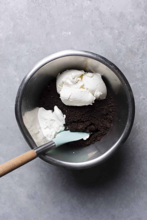 - In a large bowl, mix the Oreo crumbs with softened cream cheese and Greek yogurt until well combined. If the mixture seems dry, add 1 more tablespoon of Greek yogurt at a time until it reaches a consistency you can roll into a ball.