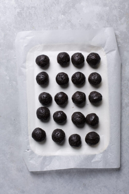 - Form the mixture into 20 balls (about 1 1/2 inches in diameter) using your hands or a spoon, and place them on a parchment-lined tray.