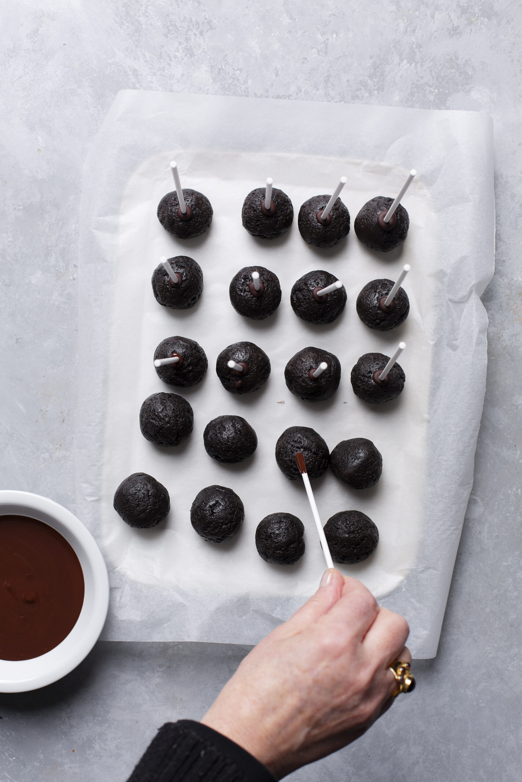 - Coat the tip of a lollipop stick in melted chocolate and push it halfway into each ball to better hold the stick in place.