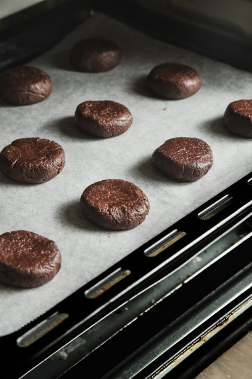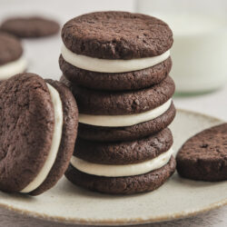 Store completely cooled homemade Oreo cookies in an airtight container with parchment paper separating layers. They’ll keep at room temp for up to 2 days or in the fridge for up to 5 days. You can also freeze these cookies for up to 3 months. Arrange them in a single layer on a parchment-lined baking tray, freeze solid (about 1 hour), then transfer to a freezer-safe container or bag with as much air pushed out as possible. Thaw overnight in the fridge or at room temp for 15-20 minutes. Let chilled cookies sit at room temp for 10-15 minutes before serving for the best flavors and textures.