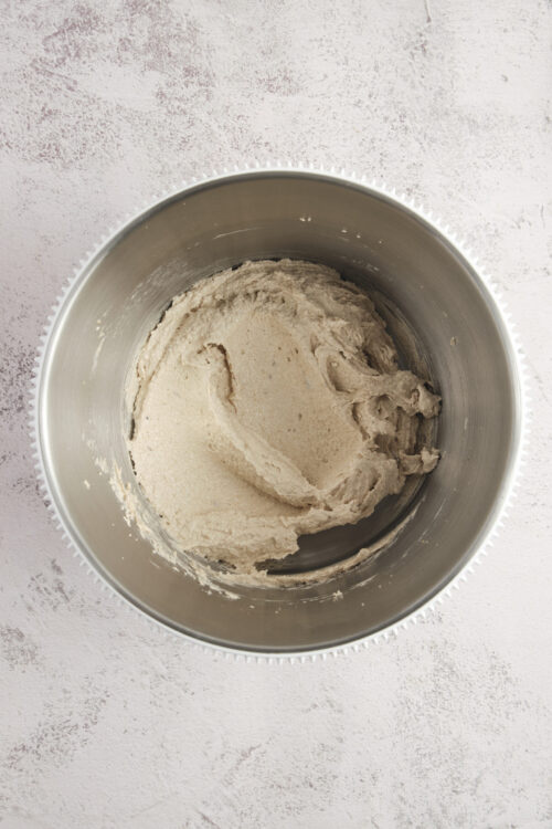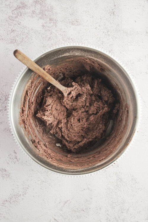 - Add the dry ingredients in 2 additions, mixing on low speed just until no dry streaks remain and a soft, thick dough forms. Do not overmix.