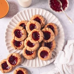 These little gems are delicious with a tall glass of cold milk or a mug of your favorite hot beverage. They make for a lovely afternoon or after-school snack. Peanut butter jam thumbprint cookies are also pretty cookies for a dessert table or tray at a potluck or party. They go with any number of other cookies, including Butterfinger Cookies and Chocolate Chip Cookies. Thumbprint cookies are also pretty on holiday cookie trays; pair them with Red Velvet Shortbread Cookies for a colorful, tasty treat.
