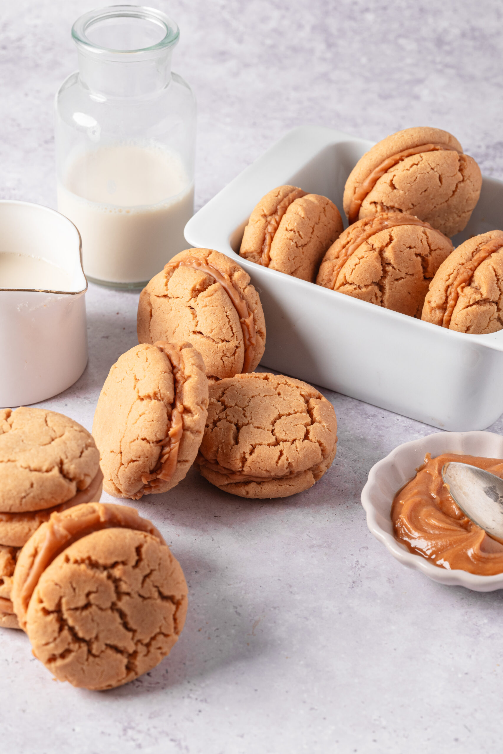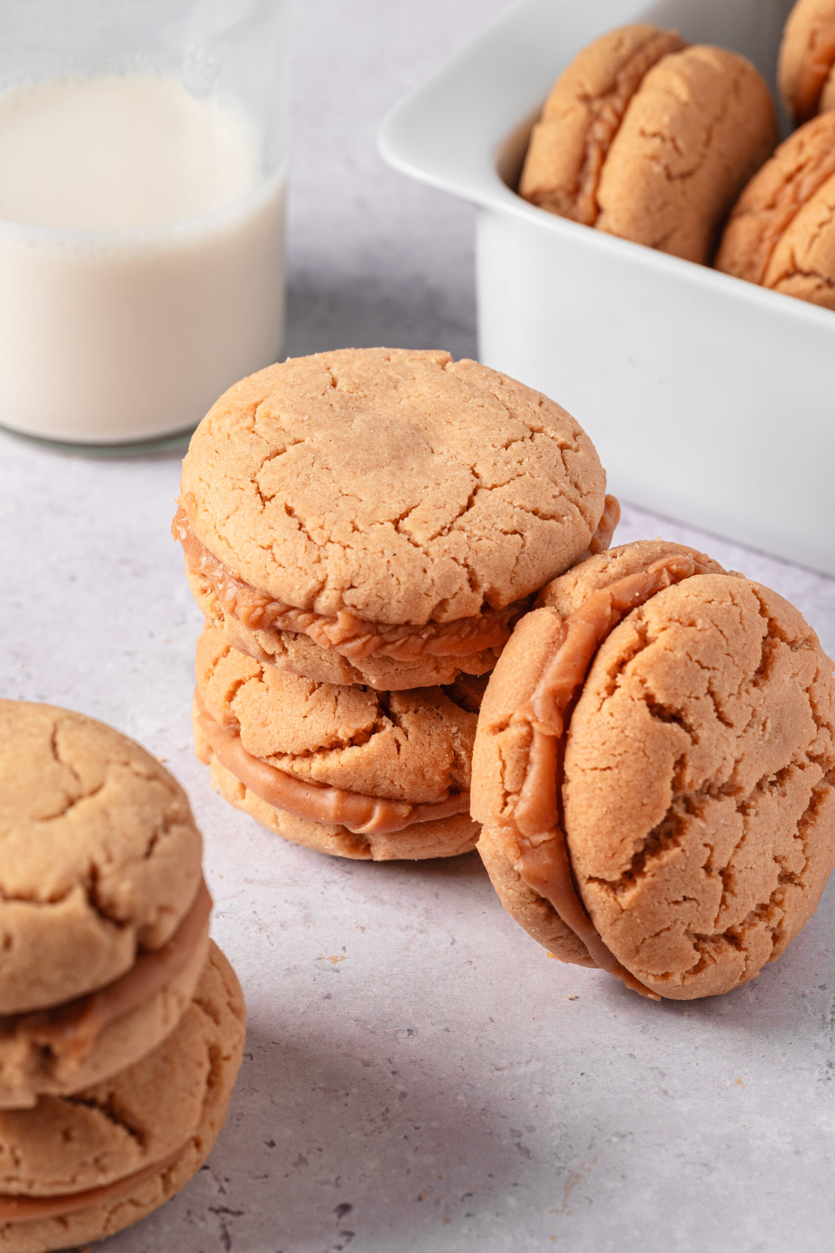 - In a bowl, mix 6 tablespoons creamy peanut butter with the powdered sugar, vanilla extract, and milk until smooth and spreadable. Spread or pipe a generous layer onto one cookie and top with another to form a sandwich. Repeat with the remaining cookies.
