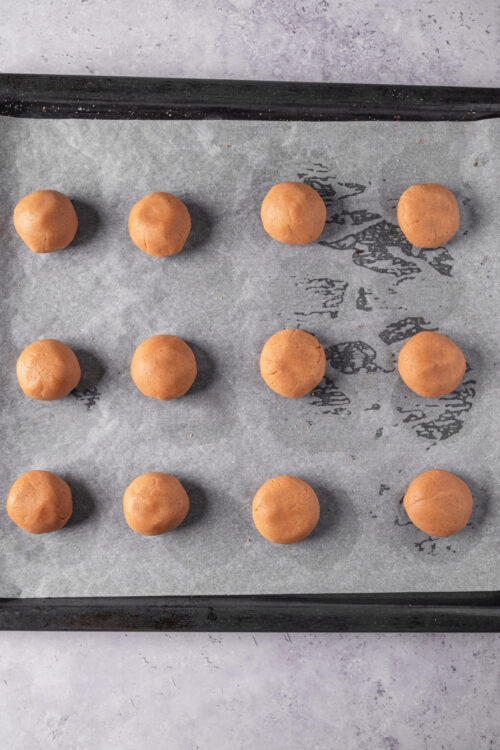 - Scoop tablespoon-sized balls of dough and place them about 2 inches apart on the prepared baking sheet.