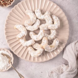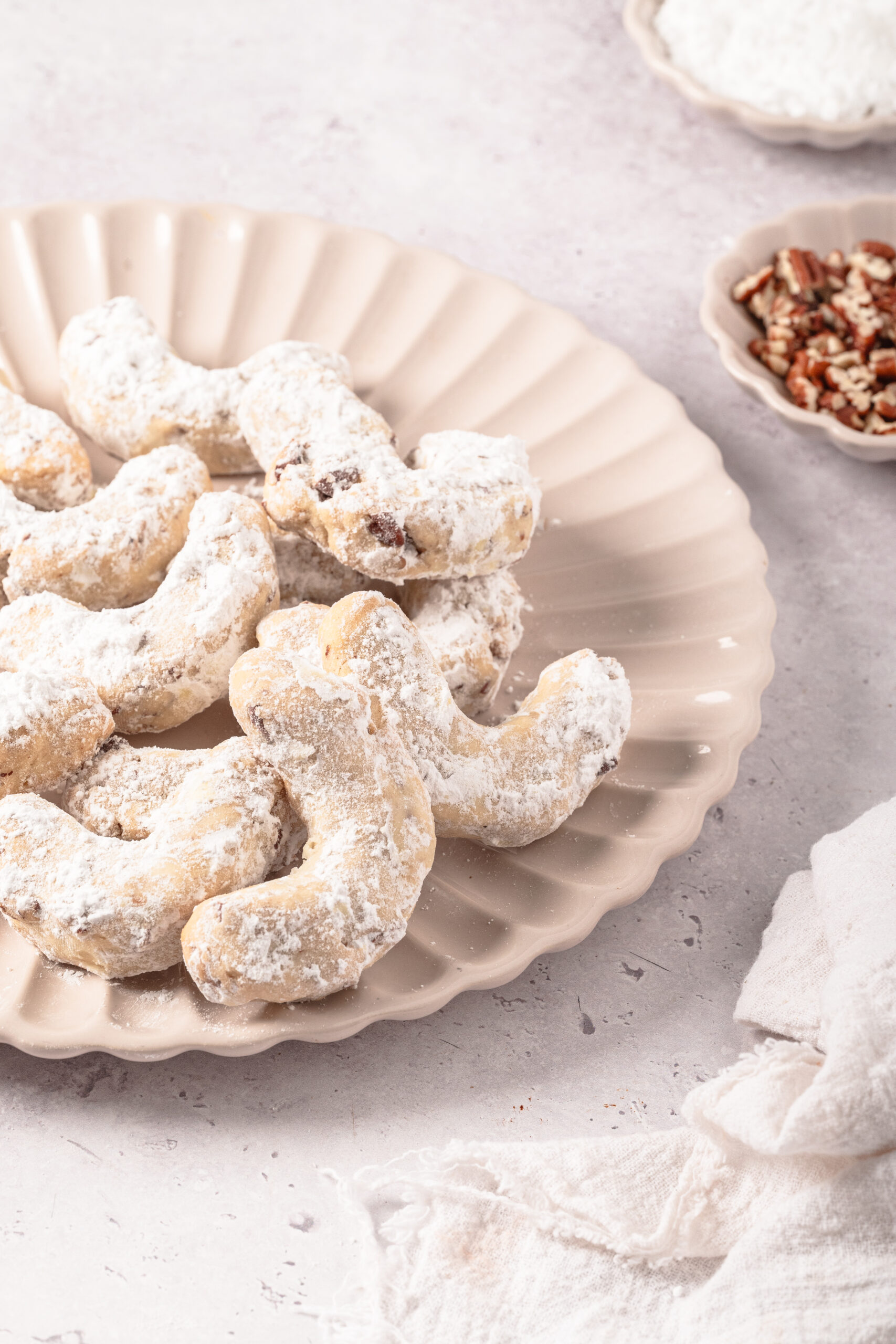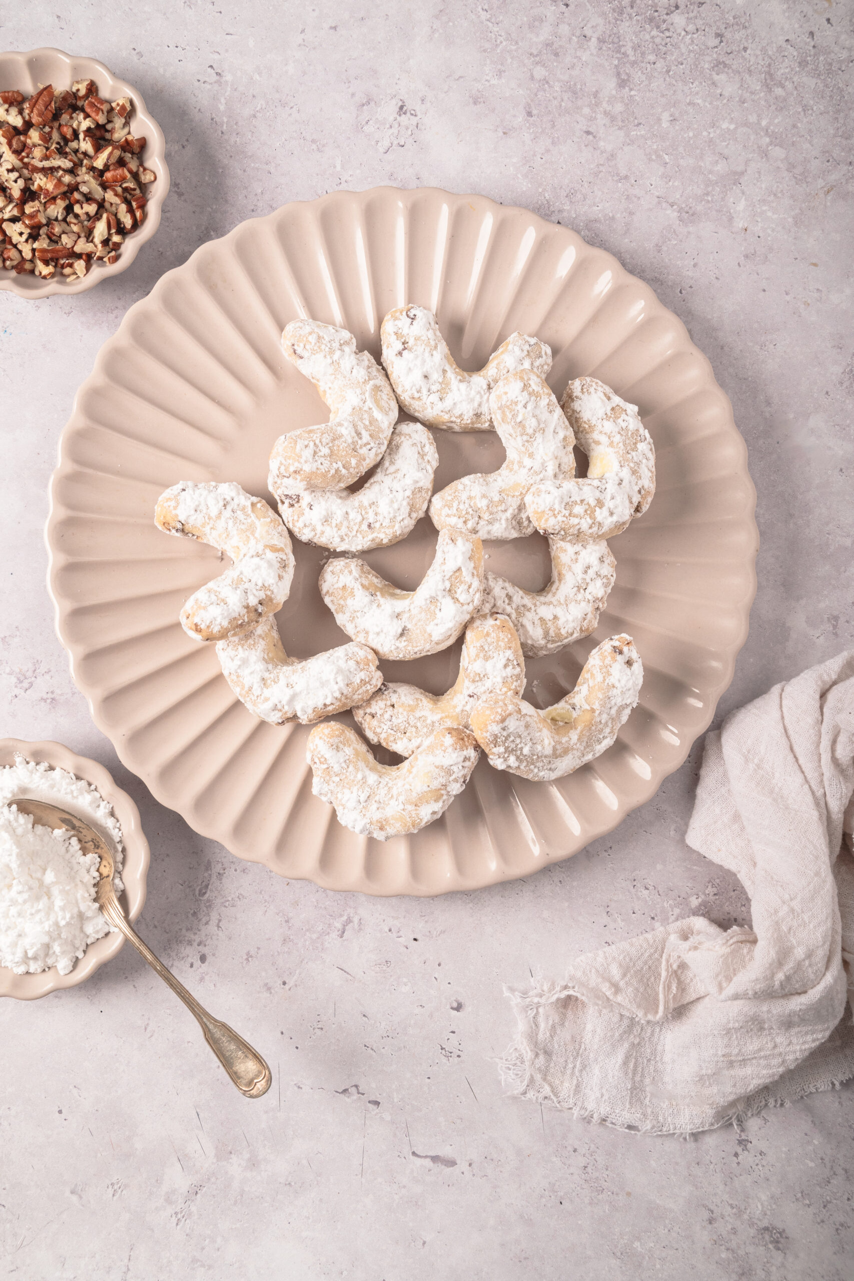 Serve your pecan crescents alongside festive beverages and other nutty treats. They pair exceptionally well with the vanilla and almond notes in a Starbucks Irish Cream Cold Brew and the vanilla-laced cinnamon notes in a Copycat Starbucks Vanilla Spice Latte. The bright citrus and warm clove flavors of Homemade Russian Tea also complement these cookies. For a full spread of classic pecan goodies, pair your crescents with Mini Pecan Pies and Butter Pecan Cookies.
