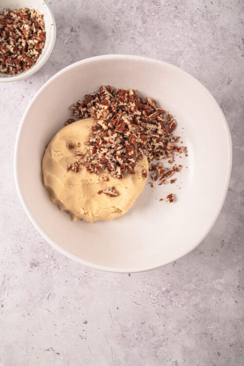 Choosing the right pecans is the first step toward cookies with deep, buttery flavor instead of flat, dusty nuttiness. Look for fresh nuts that smell sweet and rich, not oily, stale, or sharp—pecans go rancid quickly, and any off aroma will come through in a delicate cookie like this. For the best flavor, toast the pecans lightly before chopping. Spread them in an even layer on a baking sheet and bake at 325°F for six to 10 minutes, shaking the pan once or twice, just until they smell fragrant and darken slightly at the edges. Let them cool completely before adding them to the dough because warm nuts can soften the butter and make the dough greasy. Aim for a fine, even chop—pieces no larger than small lentils—so the crescents hold together cleanly without big chunks that’ll crack the cookies as you shape them. A knife gives the most control, but short pulses in a food processor will work as long as you stop before the nuts turn pasty.