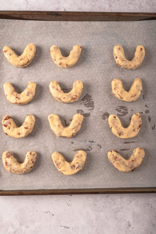 - Using a teaspoon of dough for each cookie, shape the dough into a crescent by gently rolling it between your palms. Place the crescents on the prepared baking sheet, spacing them about 1 inch apart.