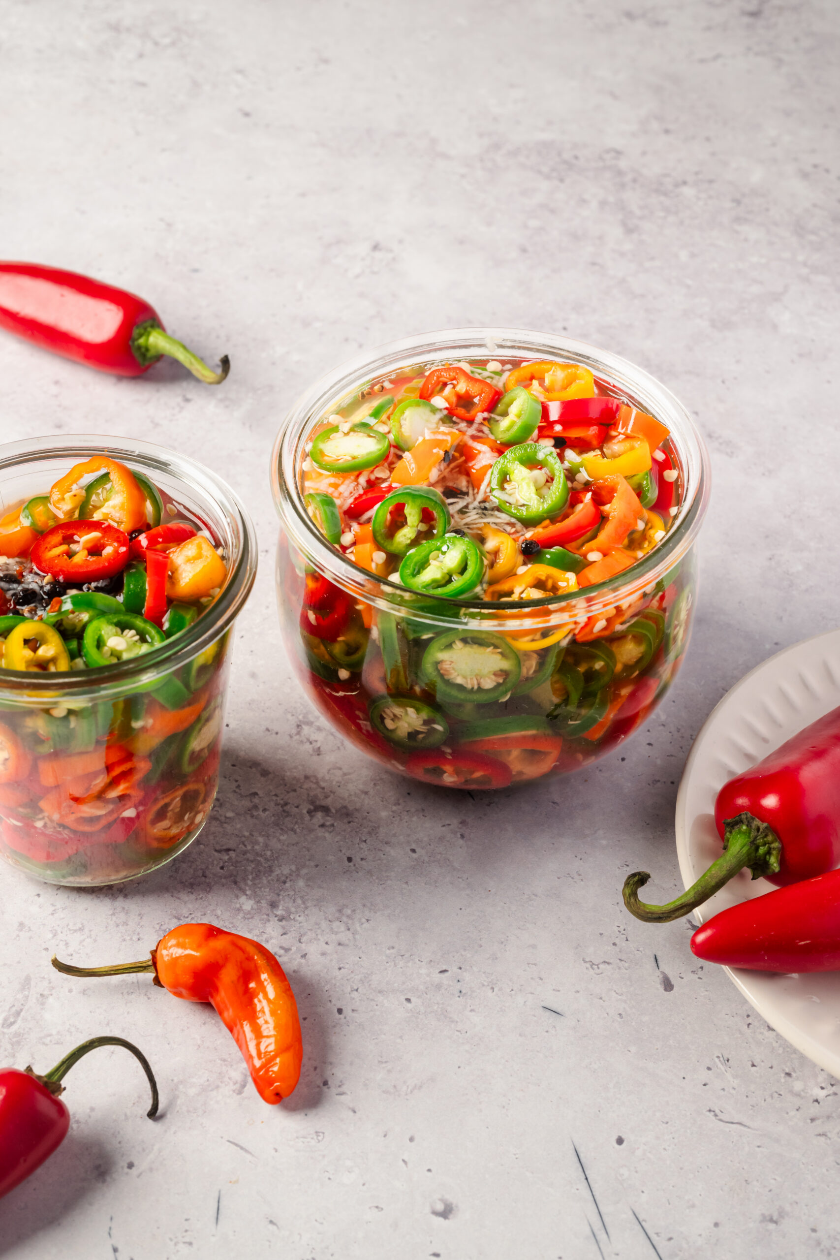 Which peppers would you like to pickle? Start by thinking about heat, texture, and color. Jalapeños, Fresnos, and serranos are classic for recipes like this one because they stay pleasantly crisp and bring gentle to moderate heat. Bell and banana peppers, on the other hand, are milder and sweeter, so they’re great if you want the tang and crunch of pickles without much spice. Mixing a few types in one batch gives you a more complex flavor—as well as a prettier, more colorful jar.