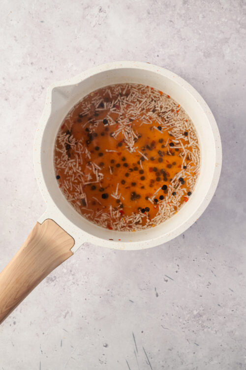 - Remove from heat and let the brine cool for about 5-10 minutes, so it's hot but no longer boiling.