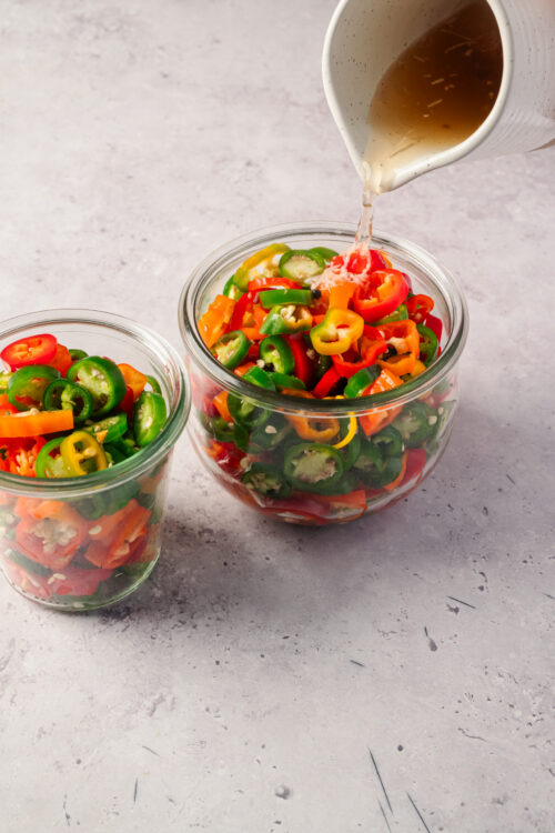 - Carefully pour the hot brine over the peppers, pressing them down gently so they submerge fully while maintaining about 1/2 inch of headspace.