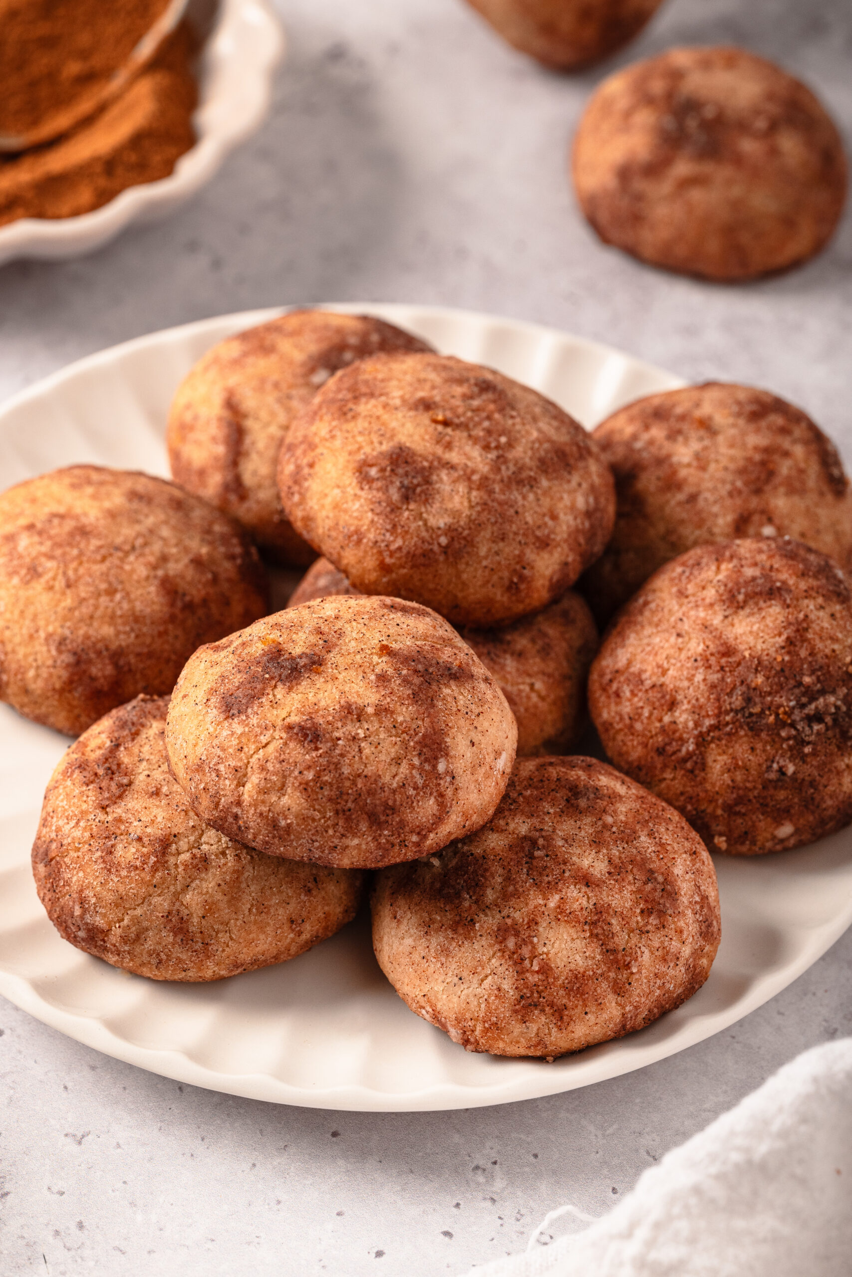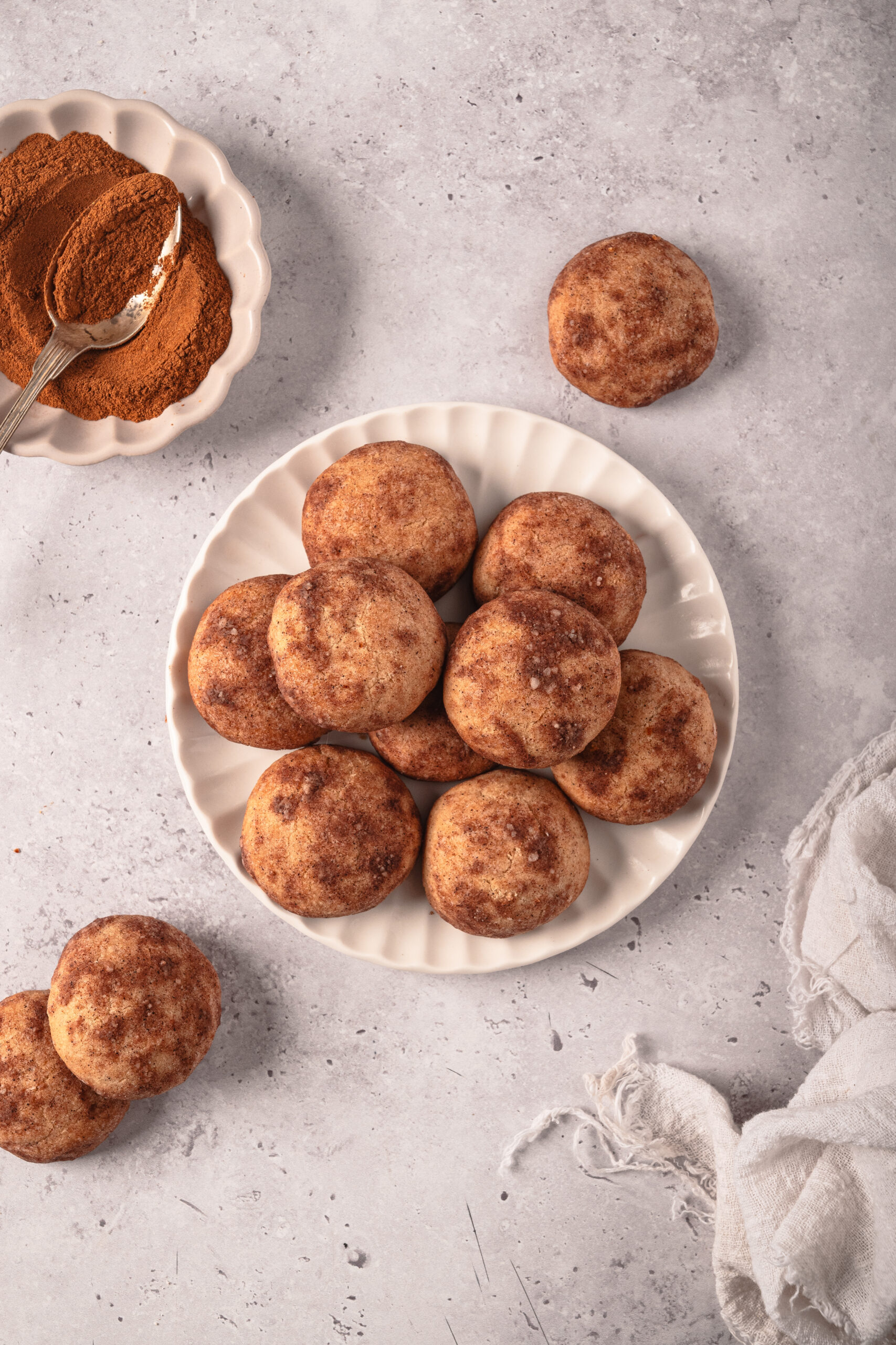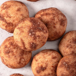 - Using a small cookie scoop (about 1 tablespoon) or a measuring spoon, portion the dough into 24 equal pieces. Roll each portion between your palms into a smooth ball, about 1 to 1 1/2 inches in diameter. Roll each ball in the cinnamon-sugar mixture to coat, then arrange on the prepared baking sheet, spacing them about 2 inches apart.