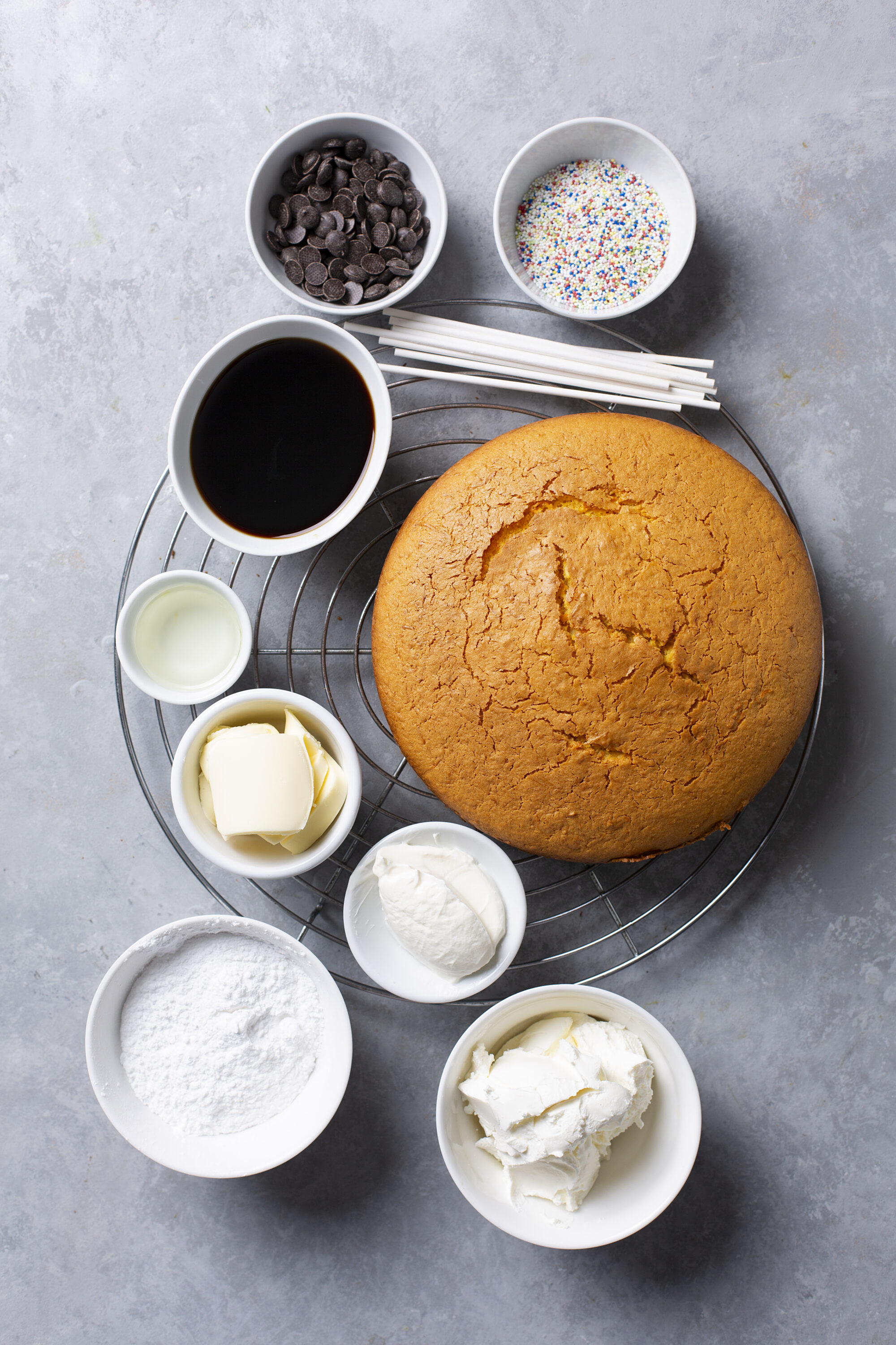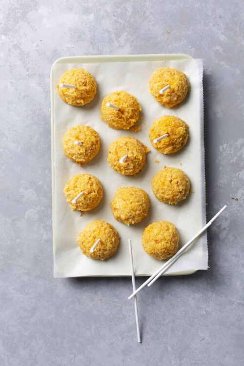 - Insert a lollipop stick halfway into each cake ball and place the cake pops in the freezer for 10-15 minutes until firm.