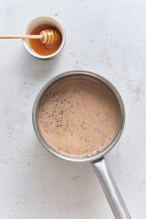 - Remove from heat and stir in the honey. Taste and adjust sweetness. If you prefer a looser, more pourable texture, stir in a splash or two of water.