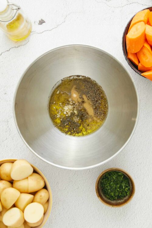 - Add the halved potatoes and carrot pieces to the bowl and toss until evenly coated.