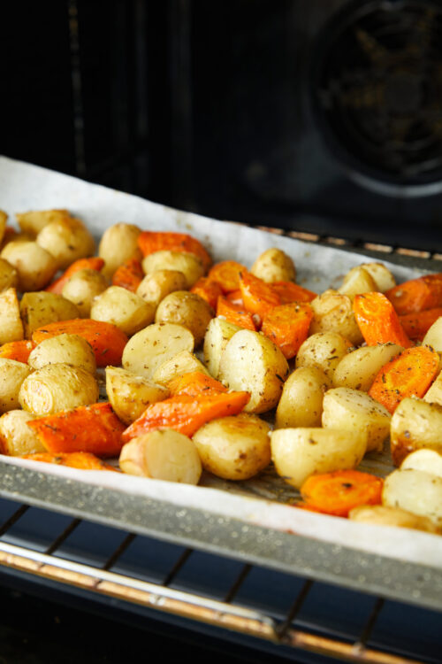 If you prefer your veggies softer, then by all means, stick with 350°F. Personally, I like 400°F because the oven gets hot enough to caramelize the carrots and crisp the potatoes while keeping them tender on the inside. Honestly, I’ll even bump the temp to 425°F for the last 10–15 minutes so they brown even more. Just keep an eye on them because they’ll turn to charcoal if you’re not careful.
