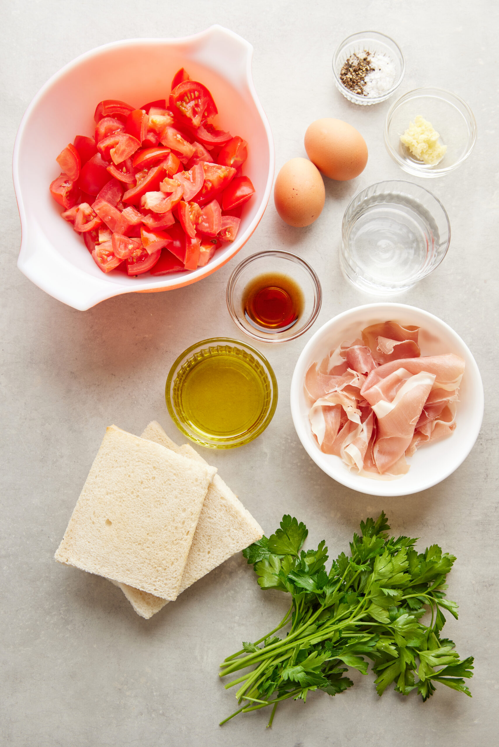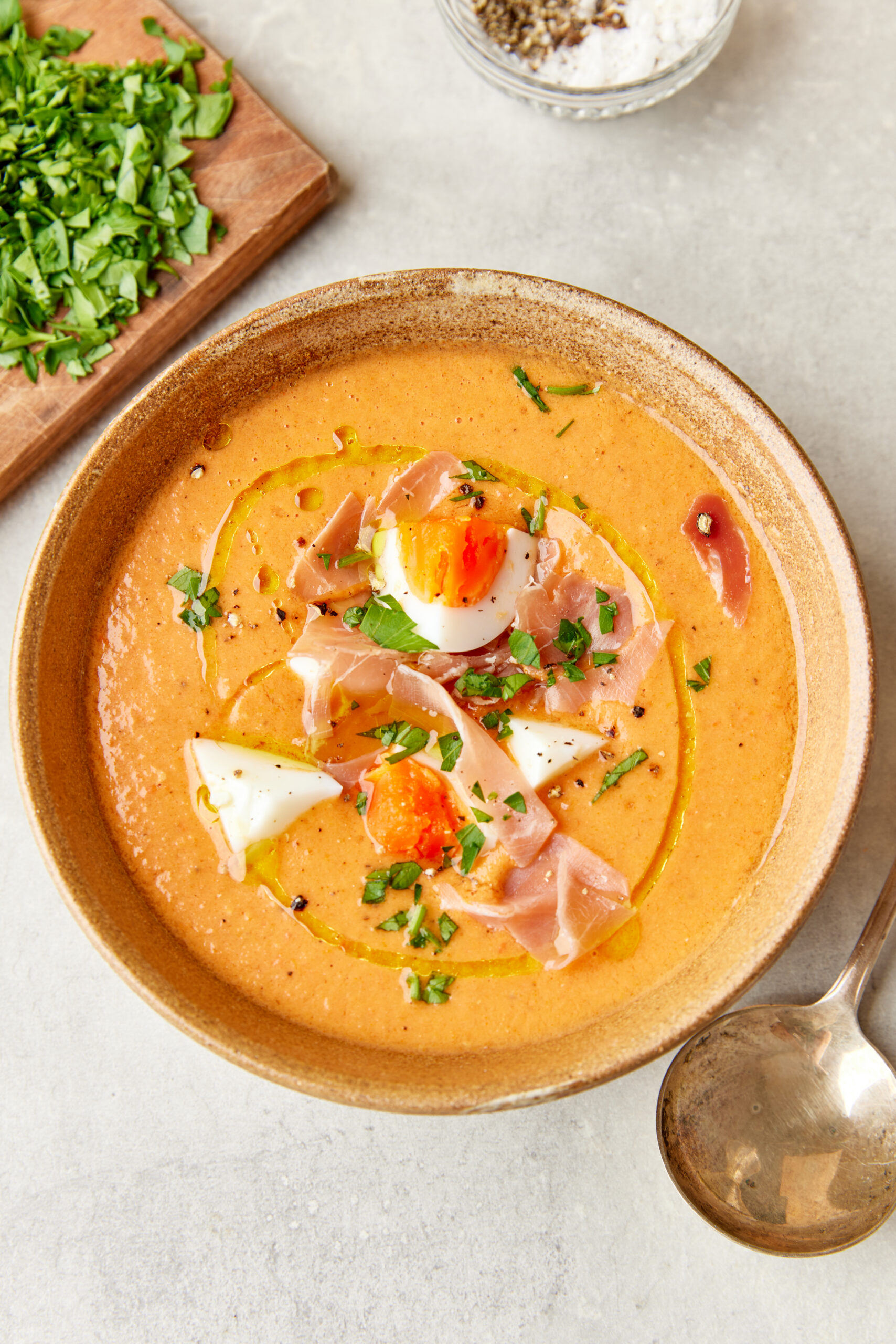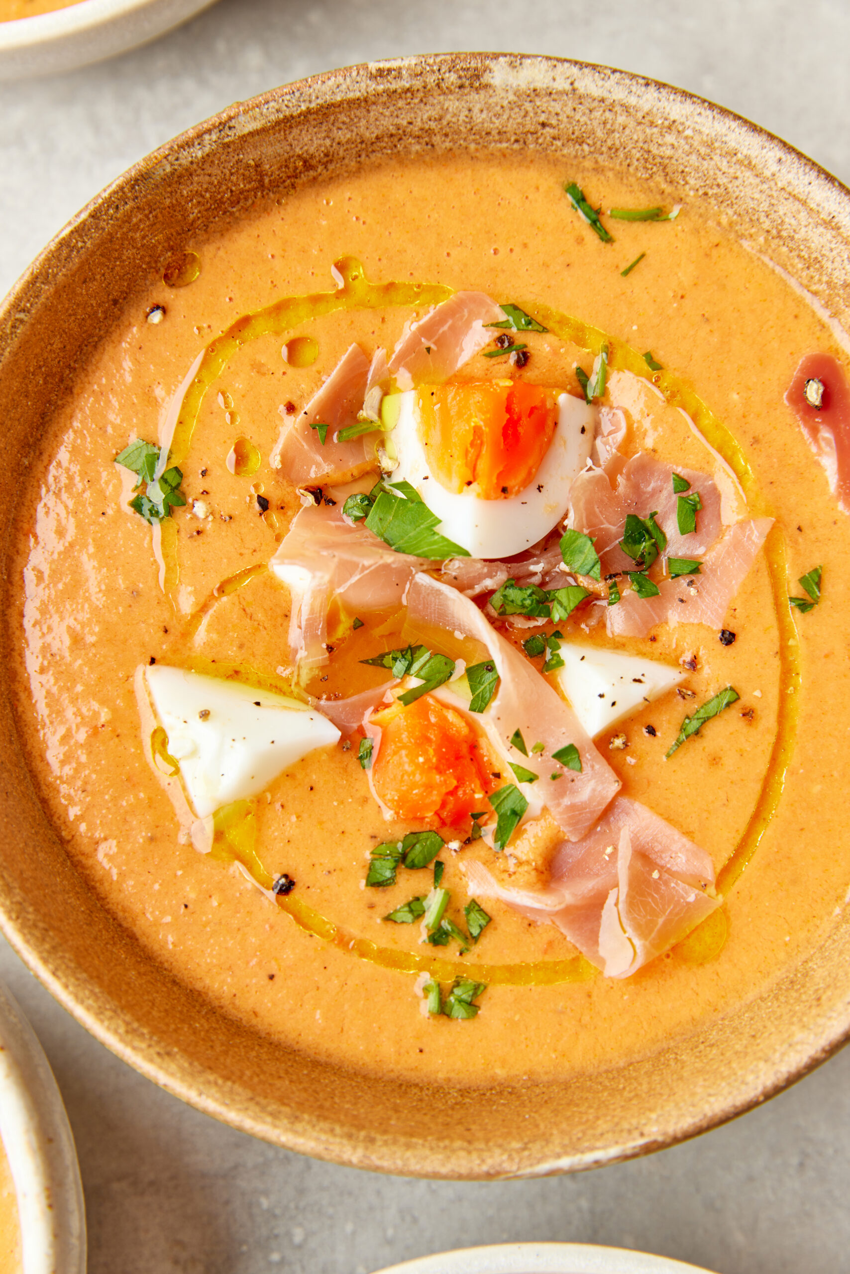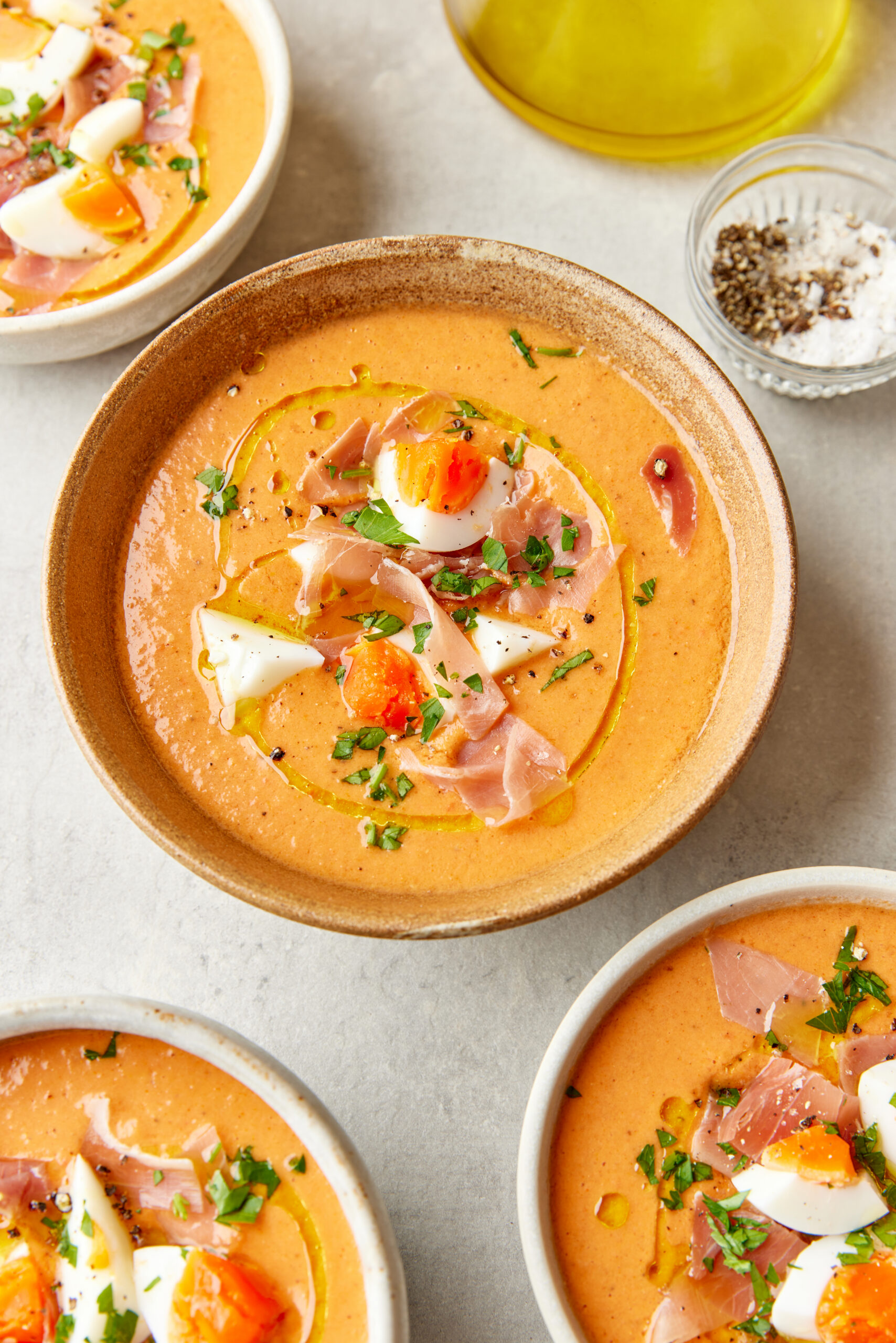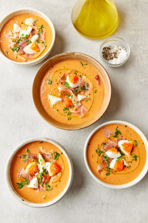 - Divide the chilled soup among 4 bowls. If using, top each serving with chopped hard-boiled eggs and diced cured ham. Drizzle a little extra olive oil over the top and add a touch of black pepper and parsley if desired.