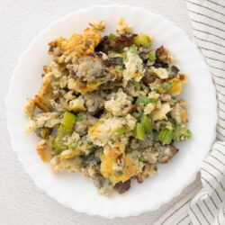 If your craving for sausage stuffing inspires you to recreate Thanksgiving in winter, spring, or summer, serve it alongside this Slow-Cooker Turkey Breast, Roasted Mashed Potatoes, and Cranberry Relish. But the thing you will discover about this sausage stuffing is that while it is a no-brainer for Thanksgiving foods, it is a perfect side for lots of other things (particularly Bone-In Pork Chops and Sweet Tea-Brined Chicken). You know how I love to do meals that share ingredients? Try this favorite of mine: Oven-Baked Sausage, sausage stuffing, and Roasted Cabbage Wedges. I also really love using sausage stuffing as a base for Curried Sausages (the curry sauce is amazing on the stuffing!). And when I have leftover sausage stuffing and need a quick lunch, I’ll top a portion of it with a Sunny-Side-Up Egg and drizzle with whatever sauce I have on hand, usually Buffalo Sauce or Ranchero Sauce.