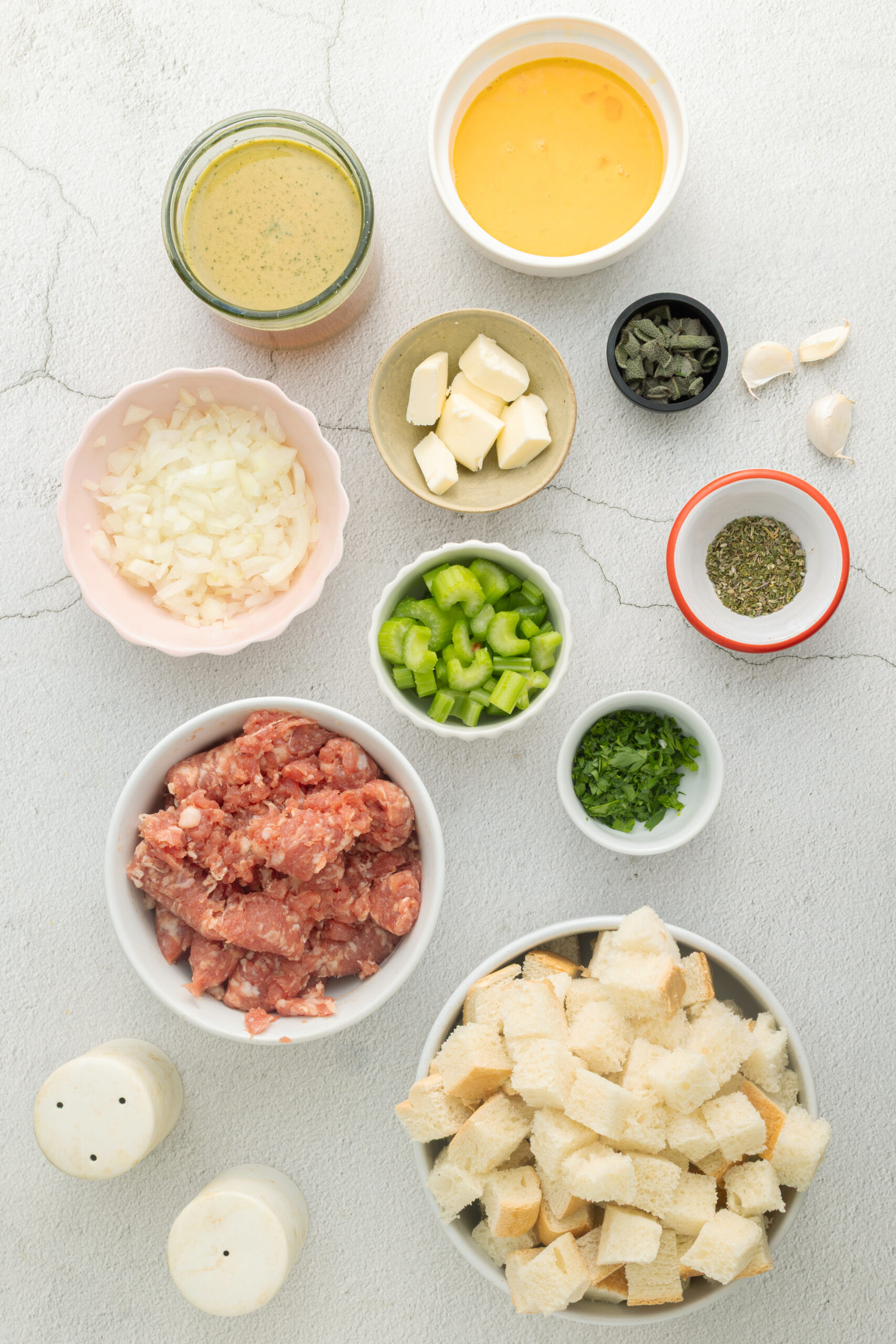 - In a large bowl, combine the bread cubes, cooked sausage, and sautéed vegetables. Stir in the chicken broth, beaten egg, poultry seasoning, chopped sage, parsley, salt, and pepper until the bread is evenly moistened. If needed, add a little bit more broth at a time until there are no dry spots.