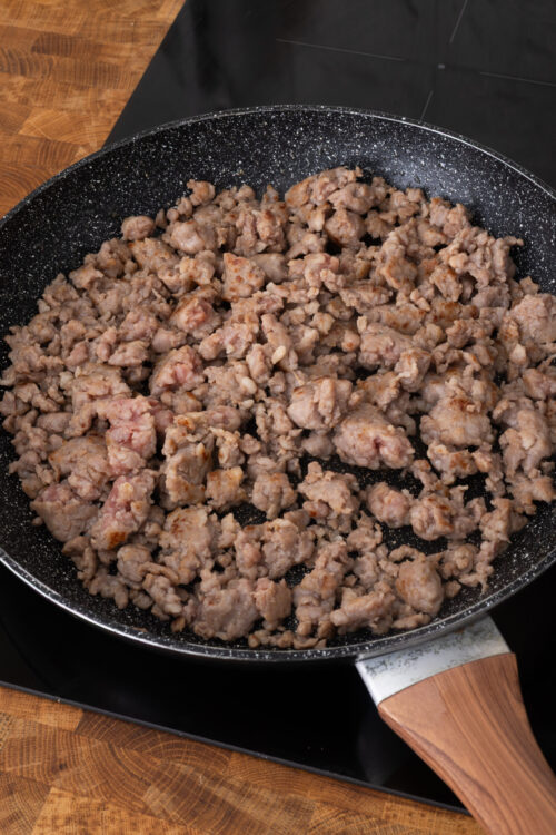 - In a large skillet over medium heat, cook the sausage until browned. Break it into small pieces as it cooks. Set aside.