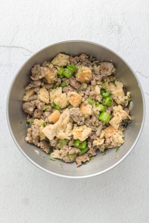Store the cooled sausage stuffing in an airtight container in the refrigerator for 3-4 days or in the freezer for up to 1 month. Thaw overnight in the fridge before reheating.