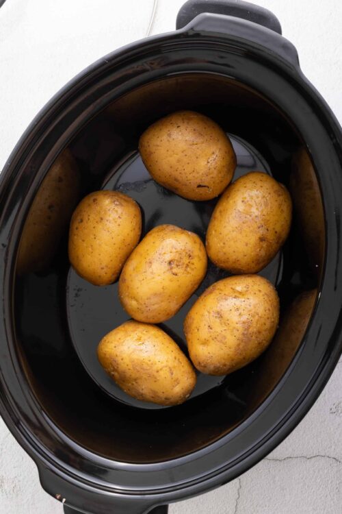 - Place the potatoes in the slow cooker without adding water. Cover and cook on high for about 3 hours, on low for 6 hours, or until the potatoes are fork-tender.