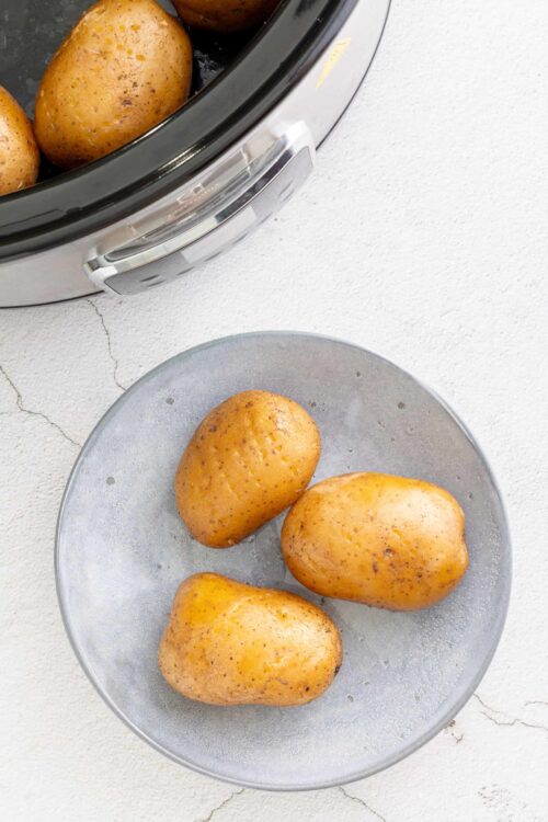 - Carefully remove the hot potatoes from the slow cooker. Slice open and serve with your favorite toppings like butter, sour cream, or chives.