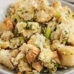 By the way, you can totally make this stuffing ahead of time! I recommend assembling the stuffing mixture completely the night before and placing it in an airtight container in the refrigerator until you’re ready to cook it.
