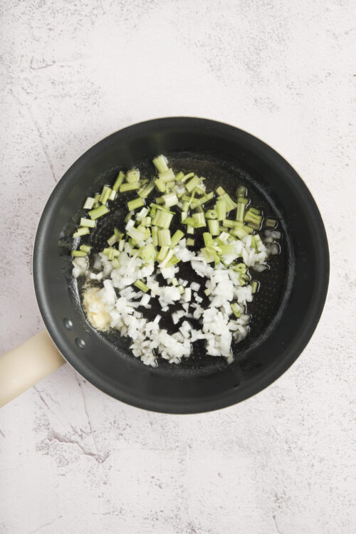 - In a skillet over medium heat, melt the butter. Add the diced onions and chopped celery and cook for 5 to 7 minutes until soft. Remove from heat and let cool.