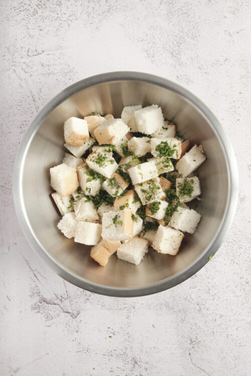 - In a large bowl, combine the dry bread cubes, poultry seasoning, salt, black pepper, dried sage, and chopped fresh parsley.