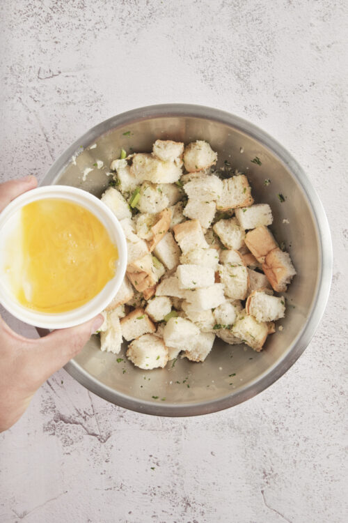 - Pour the cooled vegetable mixture into the bowl with the bread cubes. Gradually add the chicken broth while gently tossing the mixture until the bread is moistened. You might not need the full 2 1/2 cups, but you may need more depending on your bread cubes. Stir in the beaten eggs until thoroughly combined.