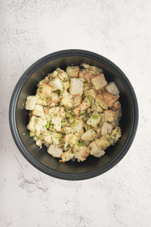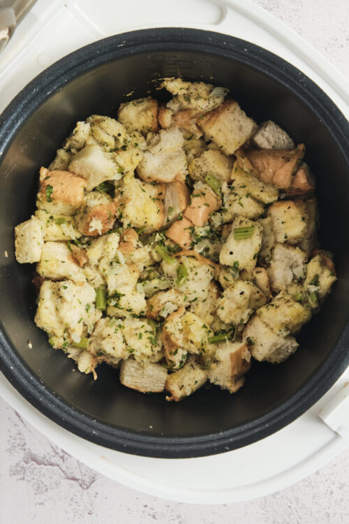 - Cover the slow cooker and cook on high for 30 minutes. Then reduce the temperature to low and cook for 2 to 3 hours until the stuffing is heated through and set. Garnish with additional parsley.