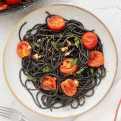While this squid ink pasta is delicious on its own, it’s even better when served with a few side dishes. Last week, I served this pasta with some Parmesan Roasted Asparagus and this wonderful Mediterranean Salad with Pomegranate Lemon Dressing—both are perfect summer sides that complement this pasta. It would also be amazing with this Grilled Romaine Salad and some Roasted Brussels Sprouts.