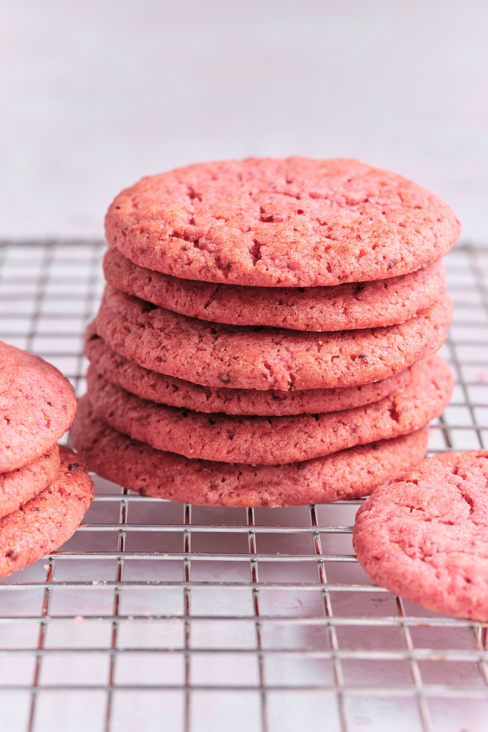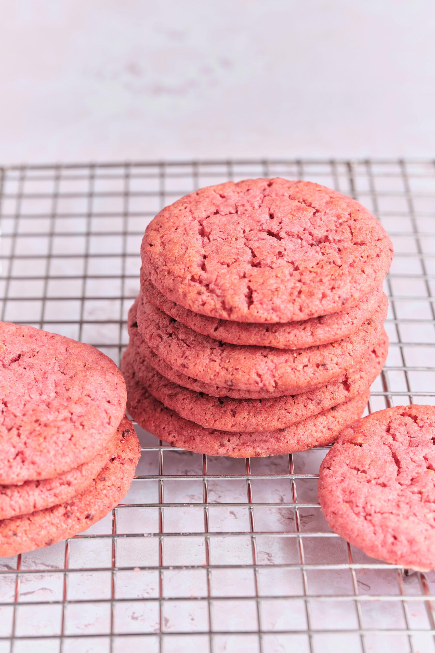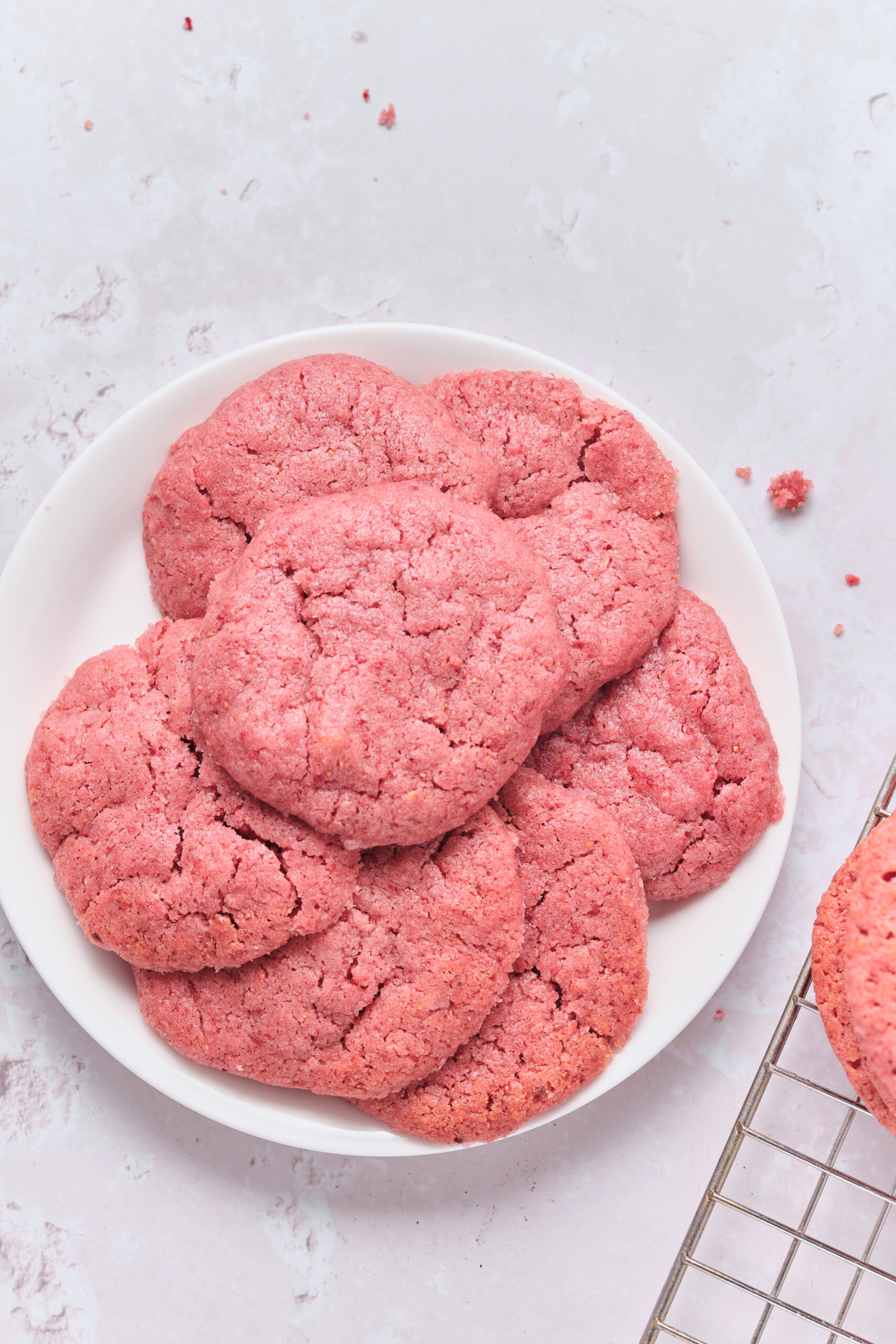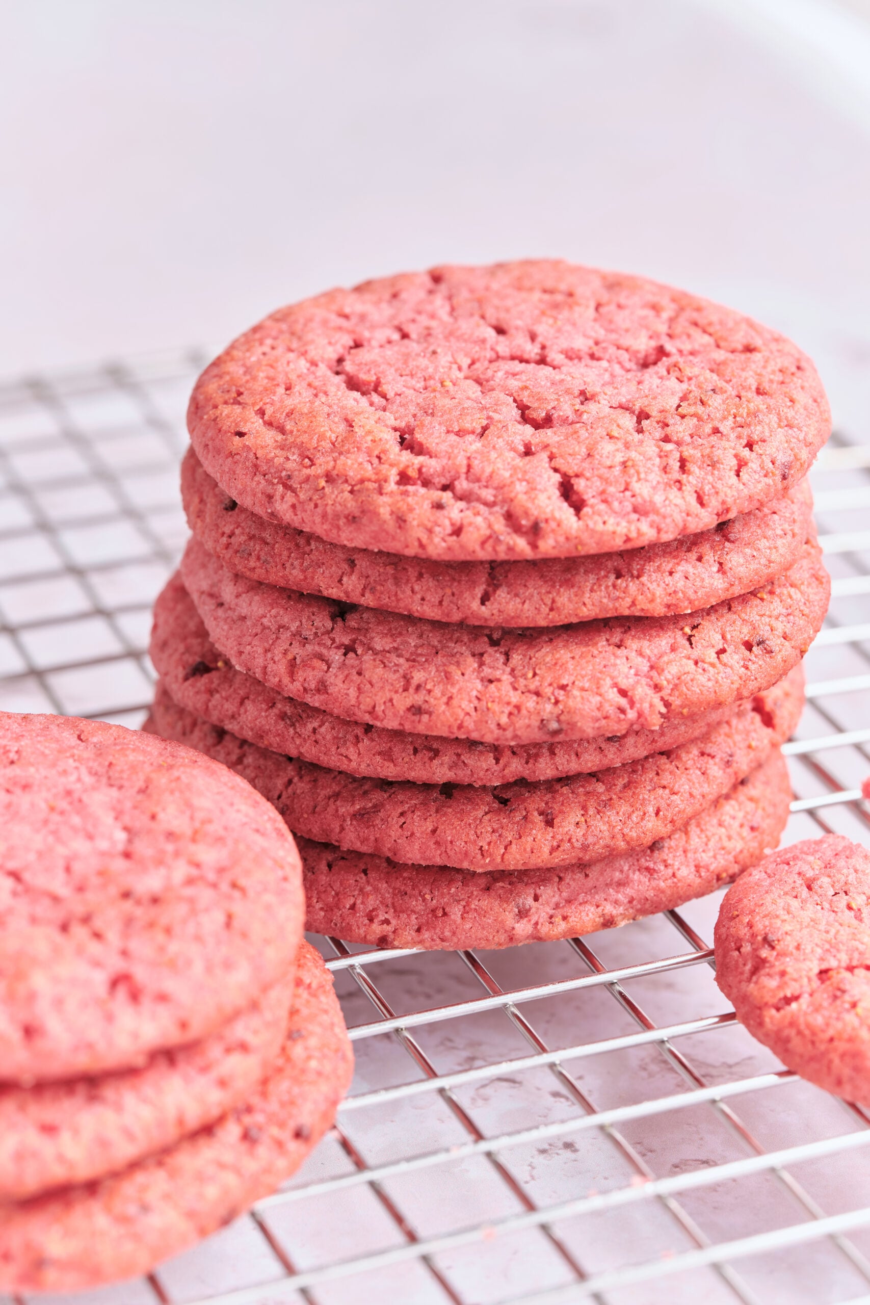 Because strawberry cookies use freeze-dried strawberries instead of loads of artificial food coloring or flavoring, these are pink cookies you can feel good about making. The freeze-dried strawberries also mean that you can make these cookies any time of year, even for Valentine’s Day, when fresh strawberries are expensive and may not be that tasty.