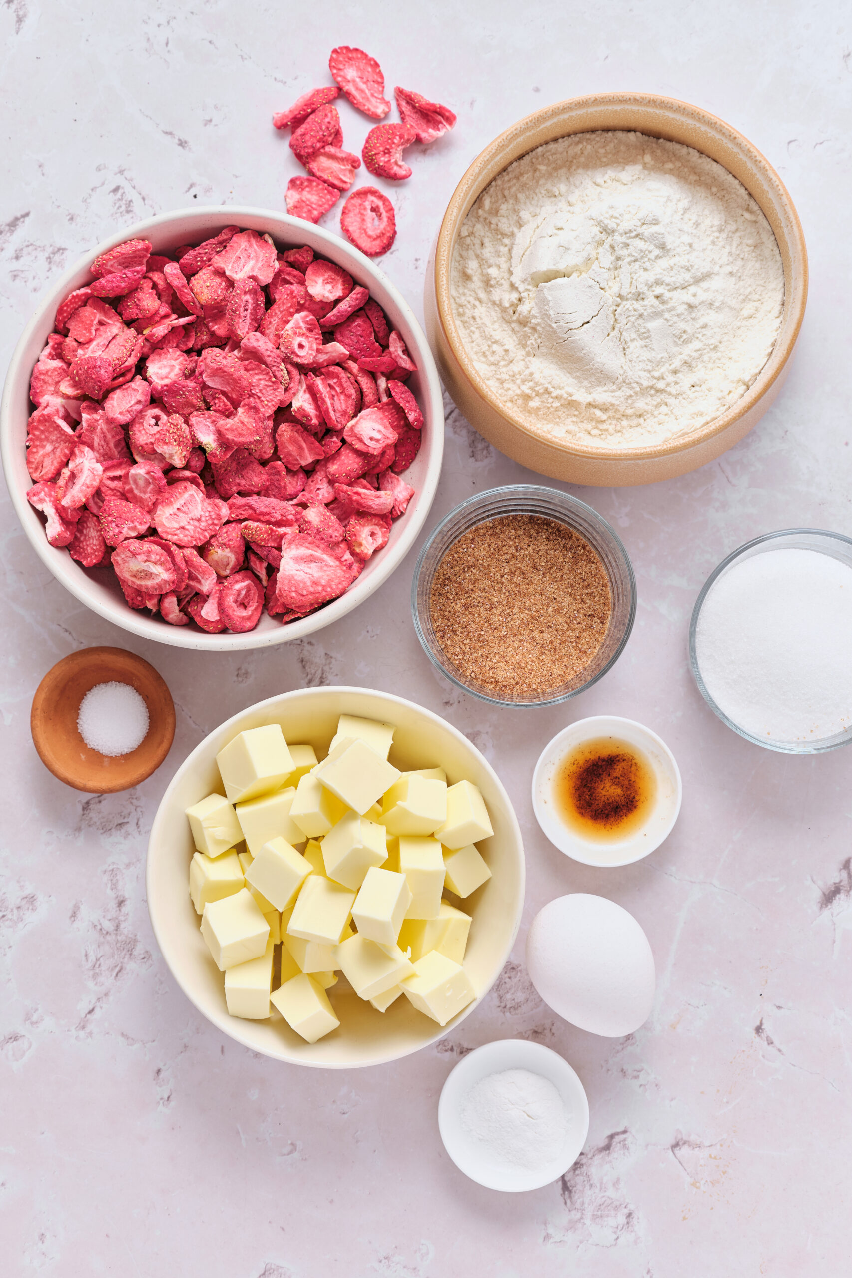 Why use freeze-dried strawberries instead of just frozen strawberries? The key is moisture. When strawberries are freeze-dried, the sublimation process sucks all of the moisture out of the frozen berries. What you’re left with is kind of like astronaut food; you get all of the flavor, color, and vitamins of fresh strawberries without any juice. For baking, this is ideal. For instance, if you just used frozen strawberries in this cookie recipe, they would release juices and make the cookies mushy and heavy. Freeze-dried strawberries solve that problem, and you’re left with just the good stuff. Look for them in the dried fruit section of your supermarket or purchase them online.