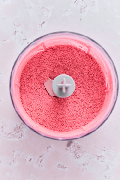 - Place the freeze-dried strawberries in a food processor and pulse until they are finely ground.