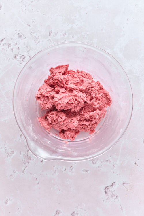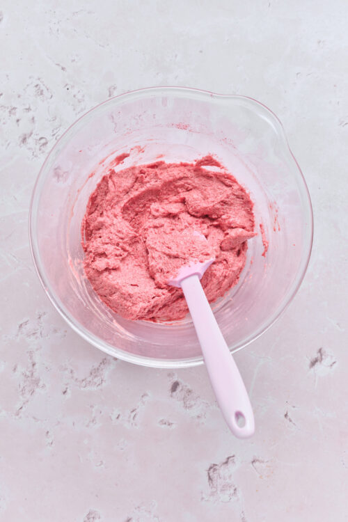 - Mix in the ground strawberries. If desired, add food coloring until you reach your desired shade of pink (it will lighten slightly after adding the flour). Add the egg and vanilla extract and mix until well combined.