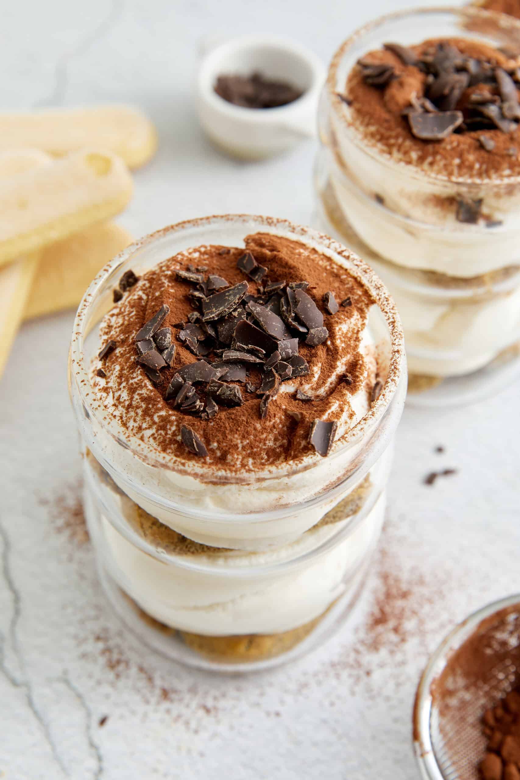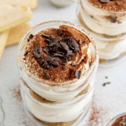 Tiramisu cups make for an exquisite dessert after a traditional Italian meal. Think antipasto, Homemade Lasagna, and from-scratch Breadsticks. You can also include them on a dessert tray or table at a party where you need handhelds. For a creative presentation, make these treats in different sizes of glasses, and that way, people can take whatever size they want. Whether it’s the only dessert you serve, or it’s mixed in with other cookies and confections (Chocolate Covered Strawberries are a great option), tiramisu cups deliver big flavor in small packages!