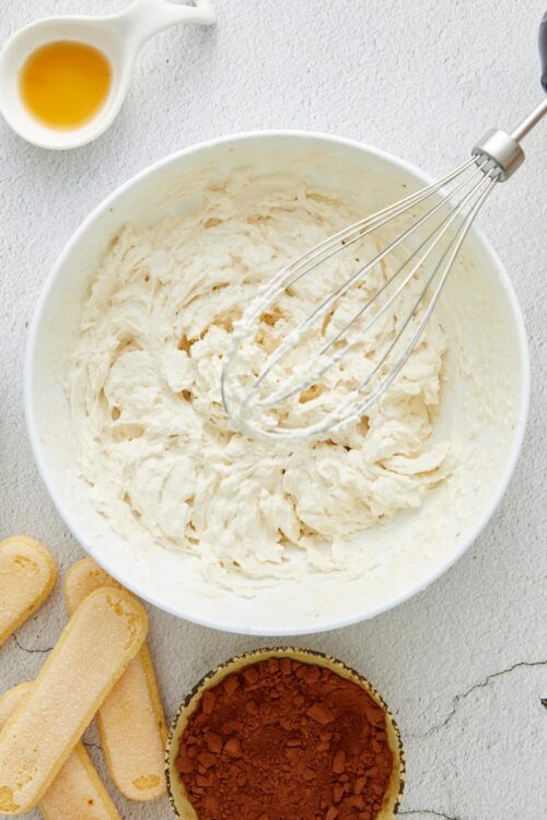 - In another bowl, stir the mascarpone cheese with vanilla extract until smooth. Then gently fold the whipped cream into the mascarpone until well blended. Be careful not to overmix.