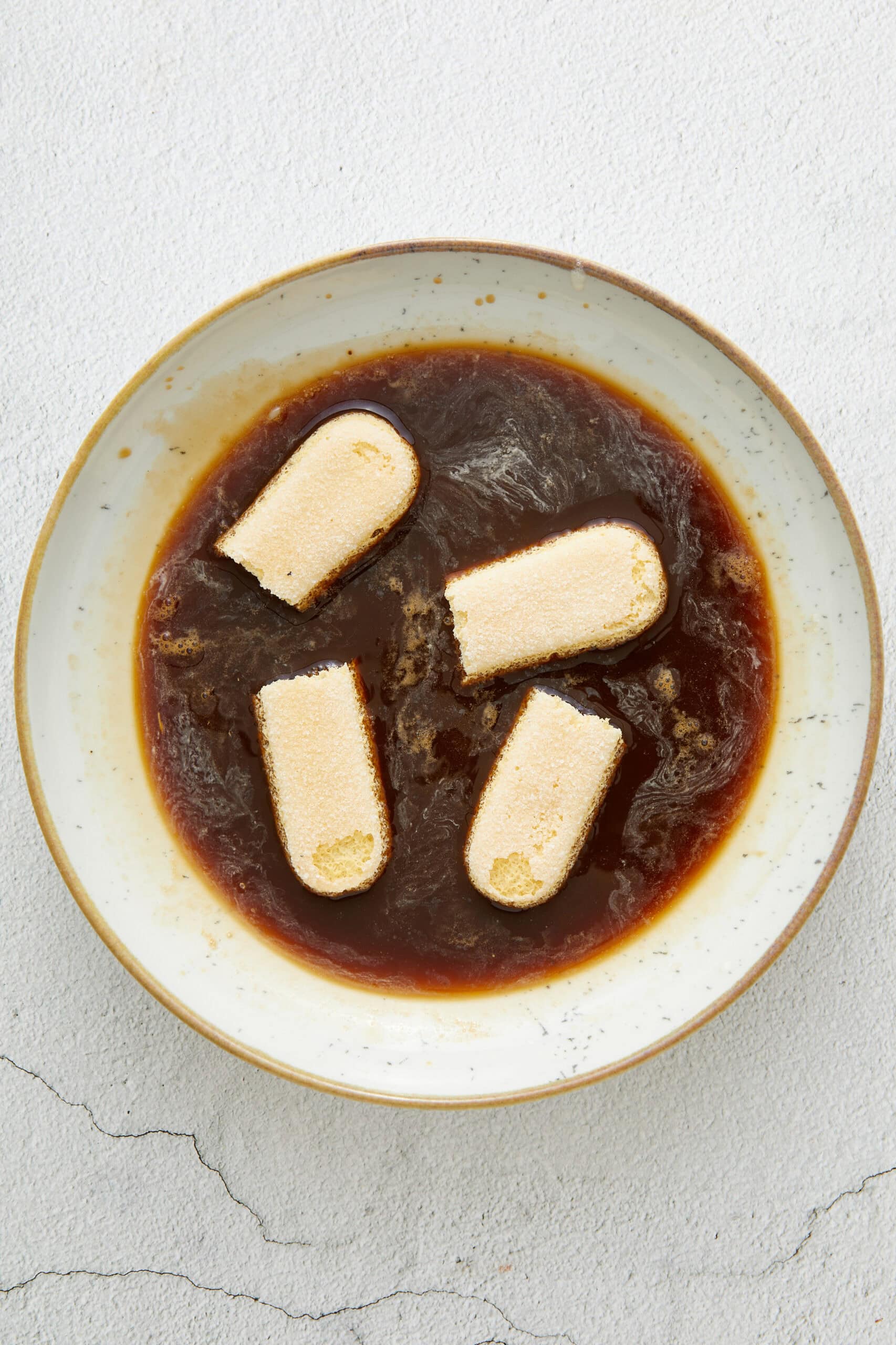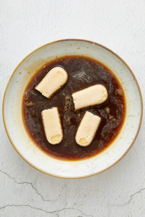 - In a shallow dish, combine the cooled espresso coffee with the sweet Marsala wine.