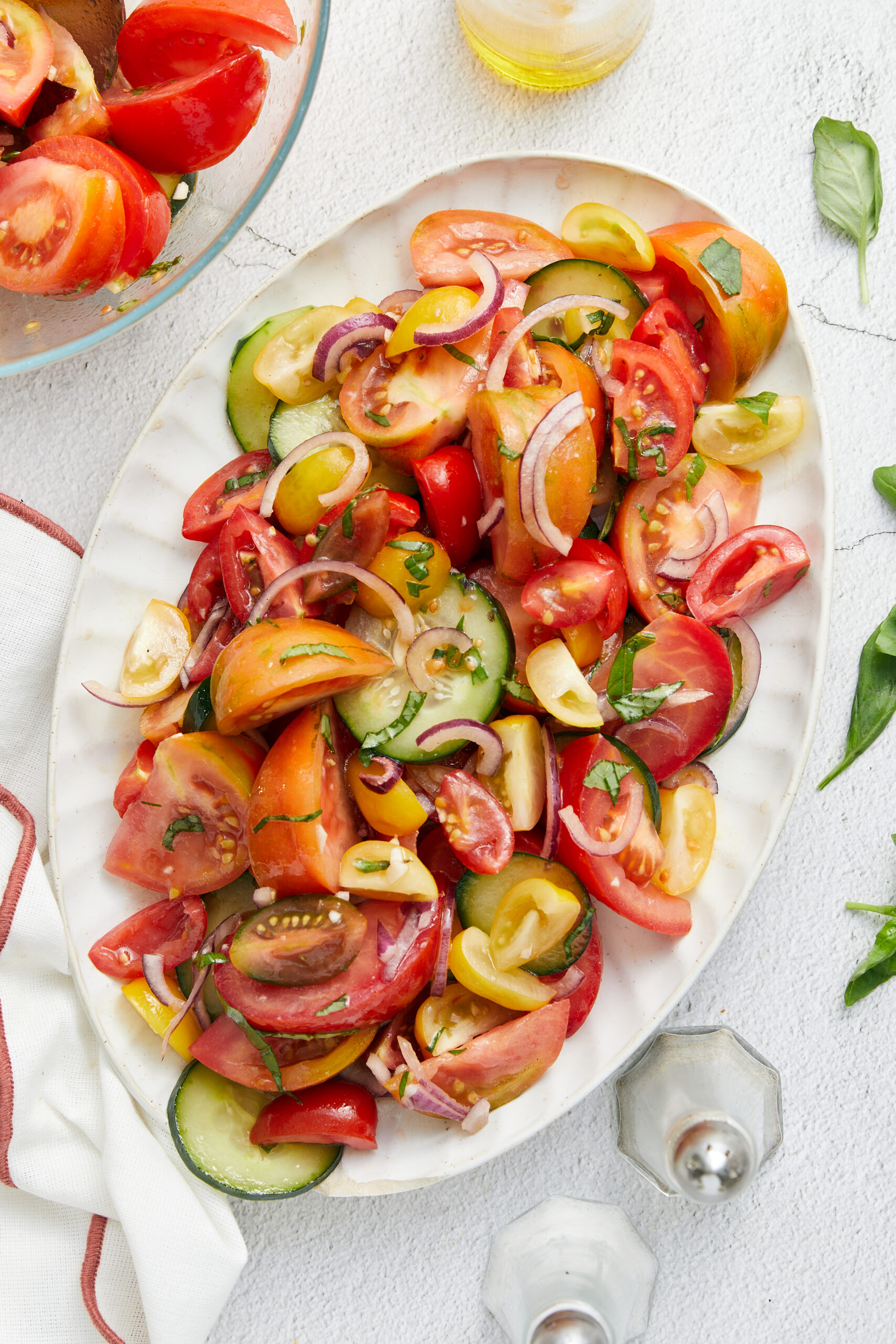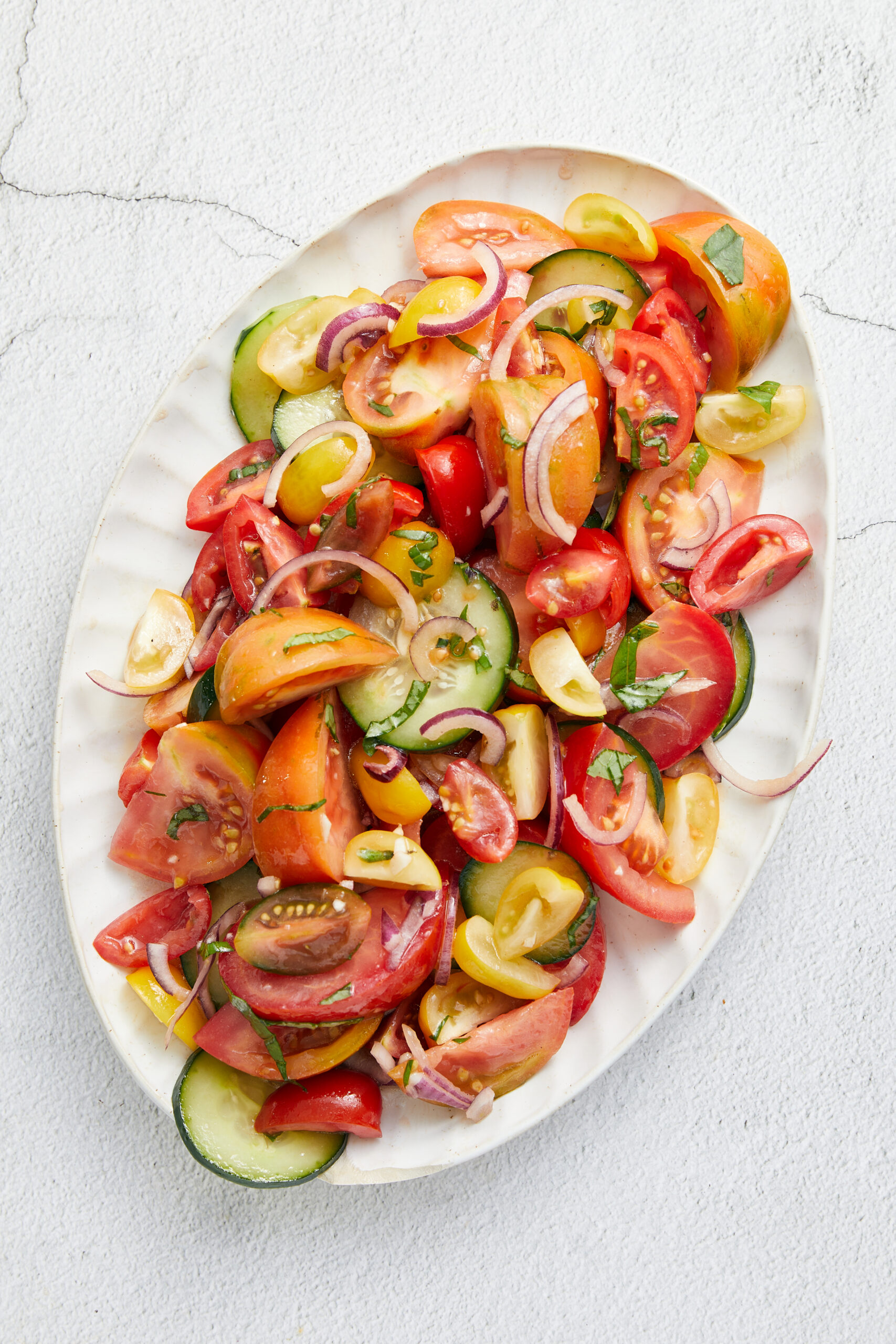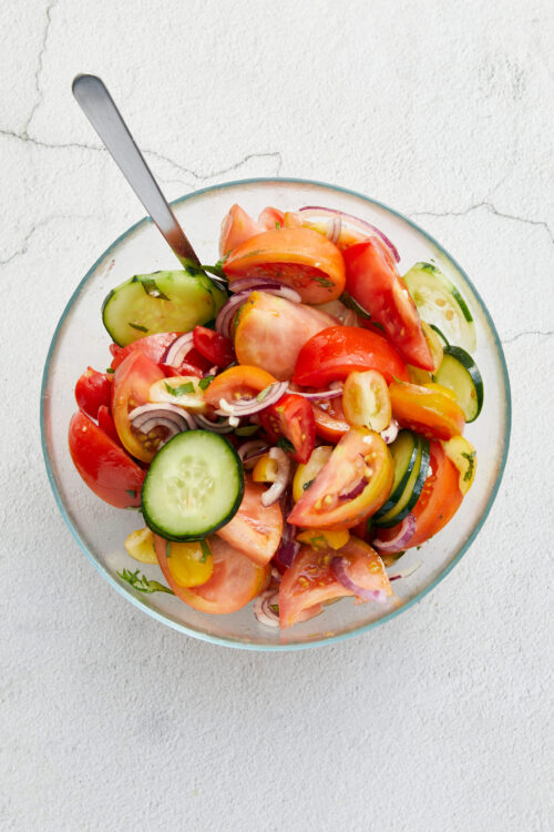 Tomato salad is a wonderful side dish for your backyard cookout or can be a main dish when it’s hot and you just want something fresh and light. The saying goes, if you want to eat healthy, eat the rainbow—meaning, eat lots of fresh fruits and vegetables, which are full of color. Tomato salad makes that an easy task: you can use a mix of red, yellow, and orange tomatoes of varying shapes and sizes. Once you toss in the red onion, cucumber, and fresh basil, you have a riot of colors to enjoy and a fresh, healthy dish.