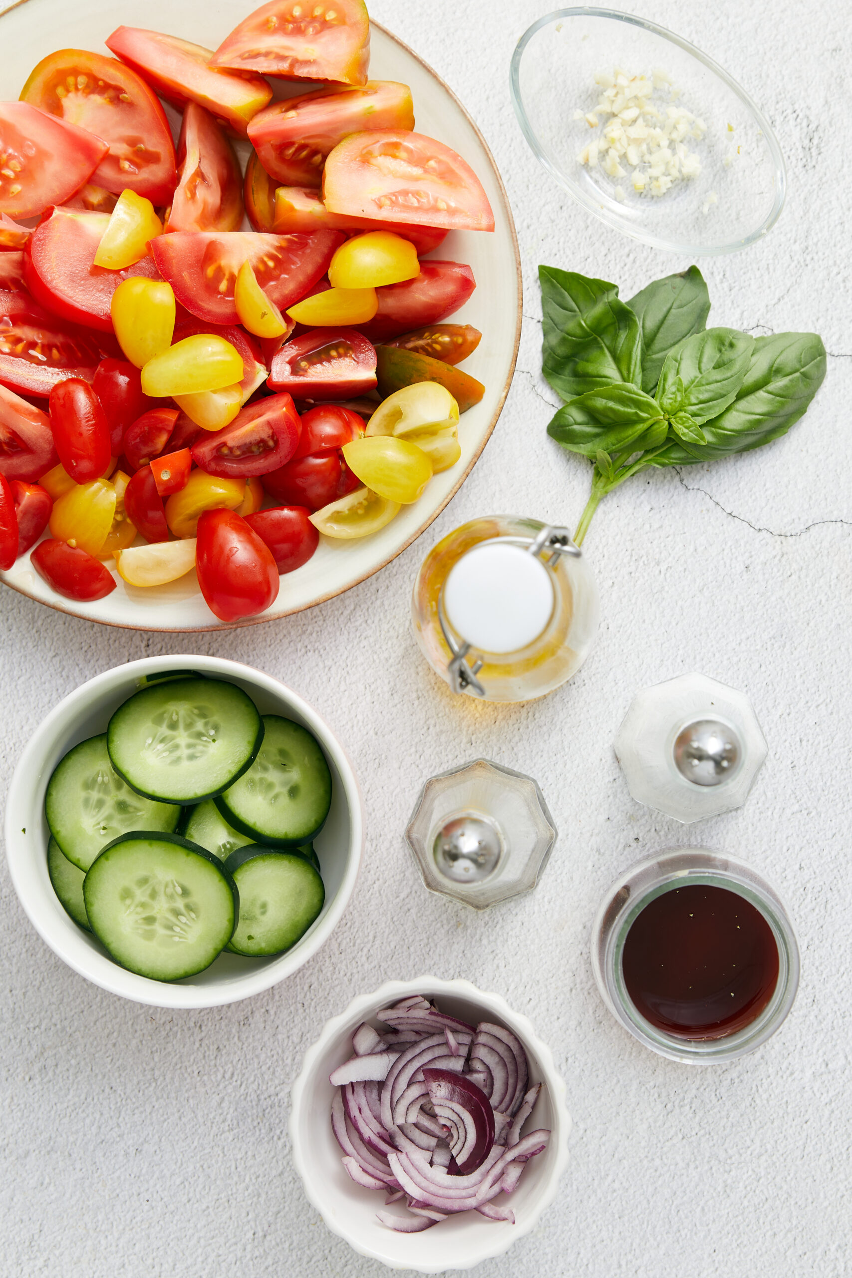 - Place the tomatoes, garlic, red onion, cucumber, and sliced basil in a large bowl. Drizzle with olive oil and red wine vinegar.