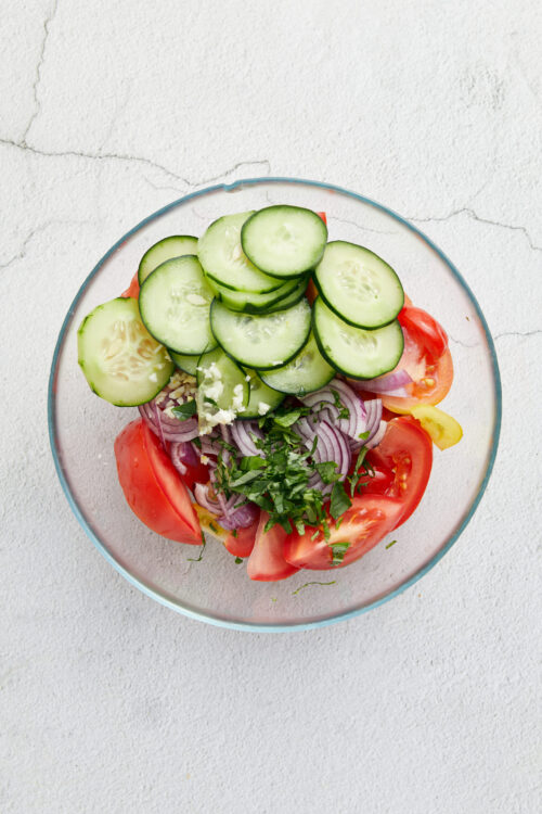 If you’ve ever grown your own tomatoes (or had a neighbor who grows their own tomatoes), you know that there is often a point in late summer where you have a bumper crop of them. So. Many. Tomatoes. It’s a good problem to have! While B.L.T. sandwiches or caprese salads are always delicious, sometimes it’s nice to have a go-to recipe where you can use mixed varieties of tomatoes. Tomato salad is the perfect example. It uses a variety of tomatoes in addition to other garden-fresh veggies and tastes like summer.
