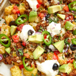 Any condiments you normally serve with nachos are delicious with totchos. We love Salsa, The Best Queso Ever, Mexican Crema, and Avocado Crema. We also love totchos with Green Enchilada Sauce. And even though totchos really are a meal unto themselves, they pair very well with Tex-Mex sides, like Fajita Veggies on a bed of Mexican Rice (yes, you can have potatoes and rice in the same meal!). And save room for dessert, especially if it’s Tres Leches Cake or crispy Sopapillas with a side of The Best Chocolate Sauce Ever.