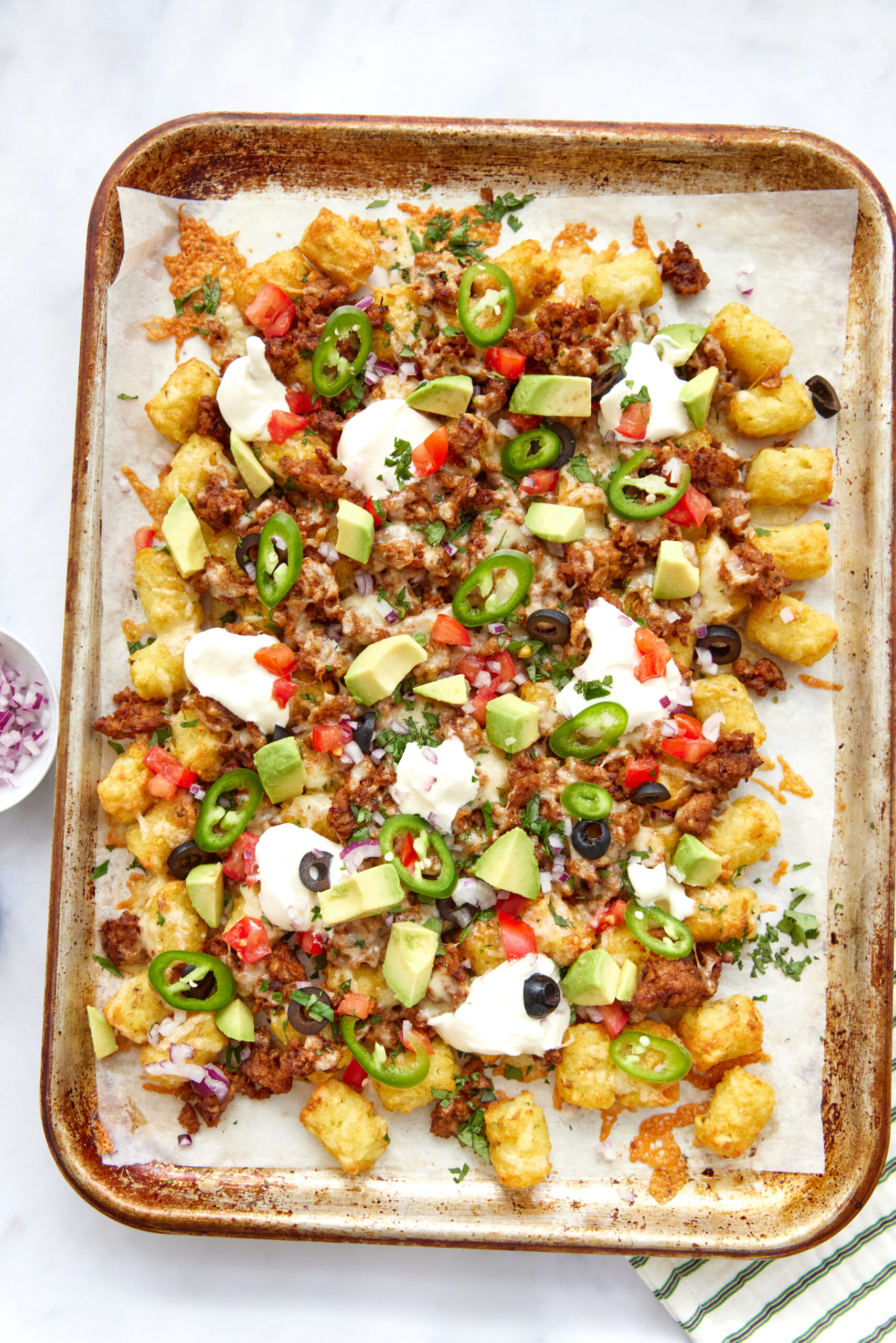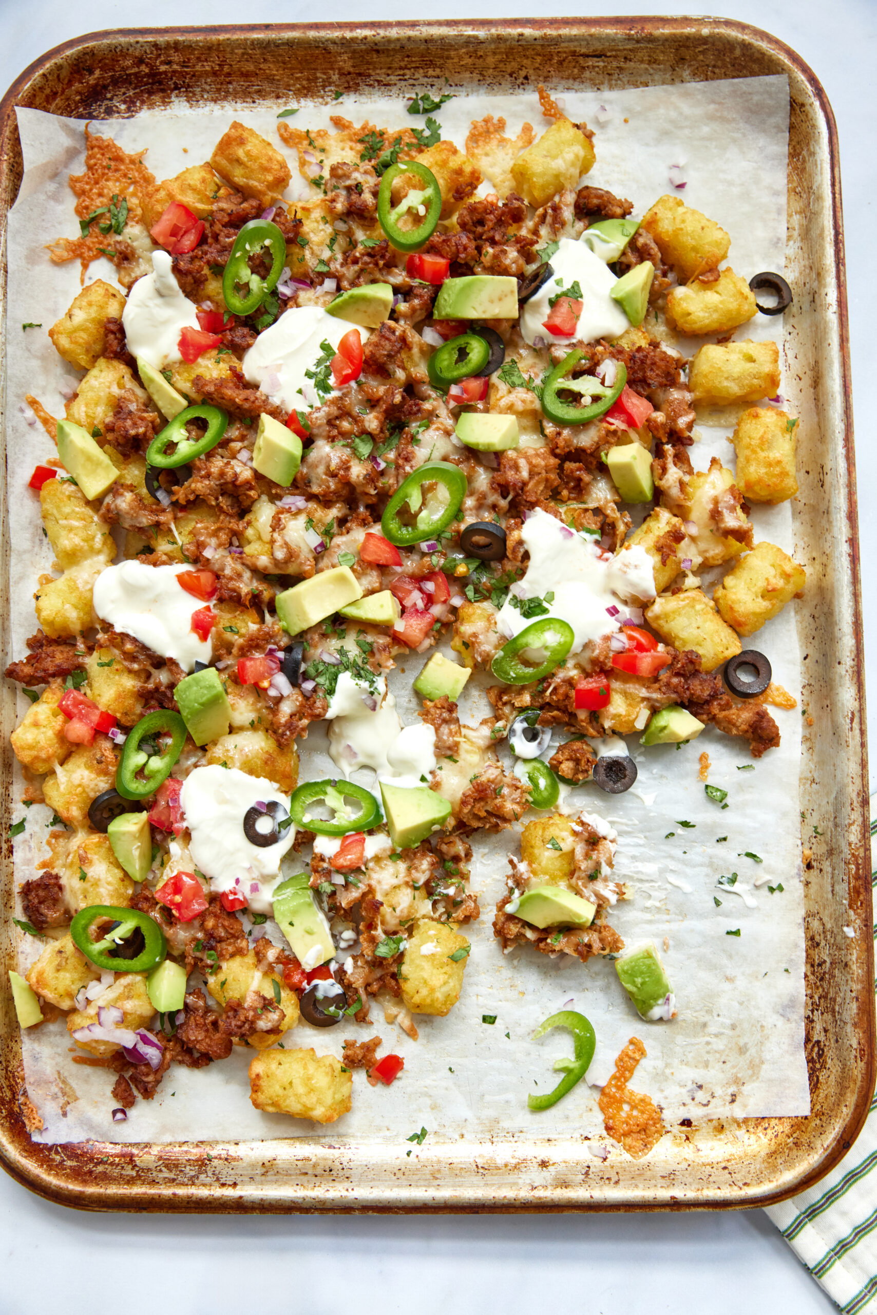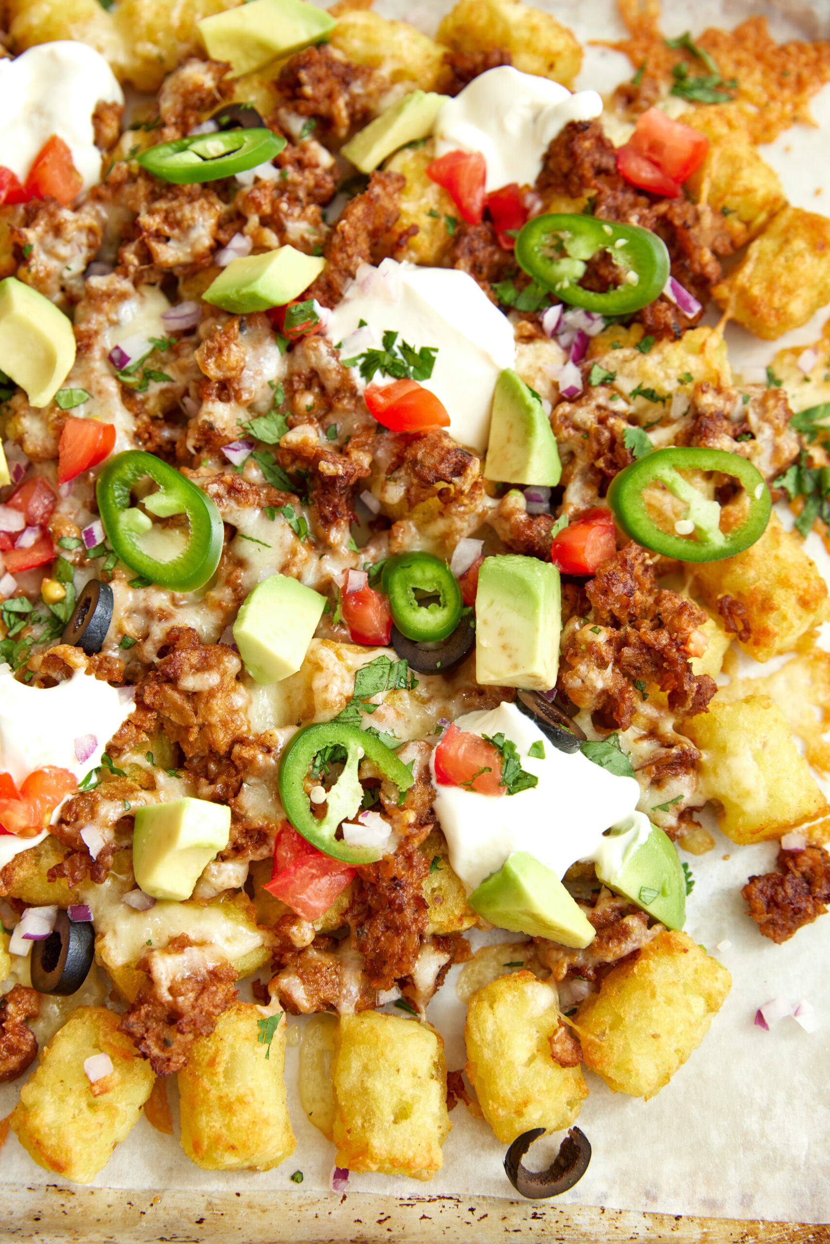 - Top your totchos with diced tomato, avocado, sliced jalapeños, black olives, red onion, a dollop of sour cream, and a sprinkle of fresh cilantro. Serve immediately while hot.