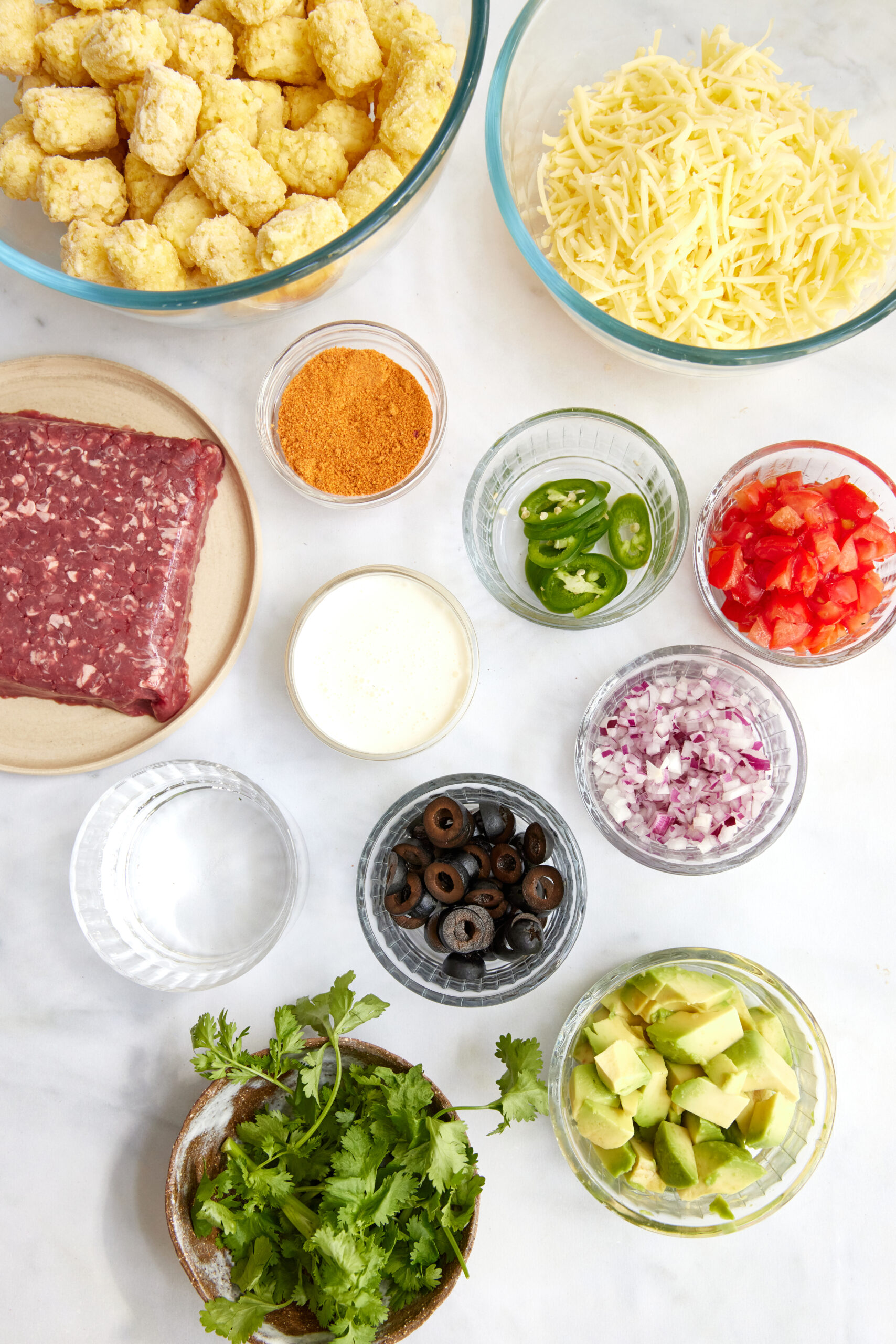 No matter how you choose to eat them, you’ll be pretty happy when you discover how easy totchos are to make. While the Tater Tots are in the oven, brown your ground beef and add the taco seasoning. Spoon the seasoned meat over the Tots, pile on the cheese, and back into the oven it goes for the melting. When that’s done, sprinkle on your favorite toppings: as you can see in our recipe, we love tomato, avocado, jalapeño, black olives, and red onion, but you do you! And enjoy.