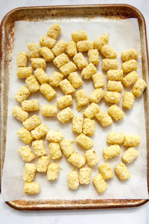 - Preheat your oven to 450°F. Spread the Tater Tots in a single layer on a parchment-lined baking sheet.